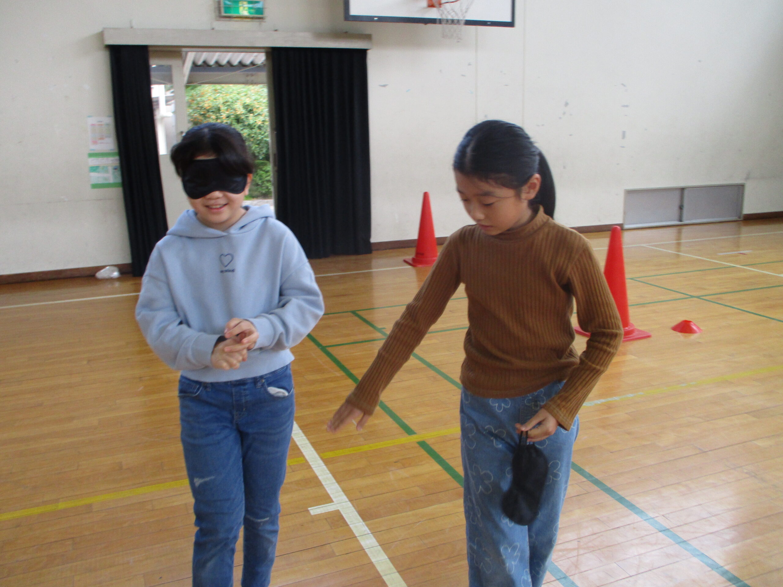 アイマスクをして歩くと、平らなはずの体育館が歩けなくなります。
