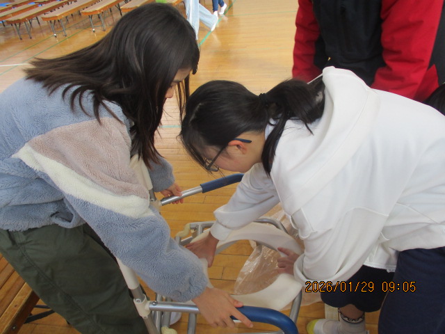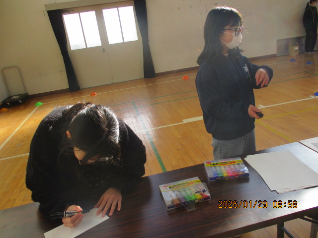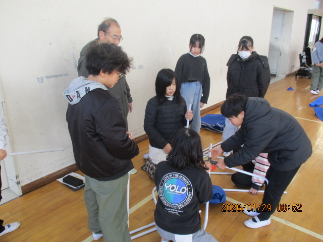 振り返りでは、「落ち着いて考えることが大事」「相談することが難しいと感じた」「寝転んでみたらあまりたくさんの人が入れないと分かった」「LINE受付は便利だと思う」などの気づきを共有できました。最後に自治会長さんからは、大人を頼りながら自分達でできることを見つけられたことや、協力してすばらしい設営ができたとほめていただくとともに、あいさつなどをして日頃から地域の方と顔見知りになっておくことで安心な気持ちになると教えていただきました。