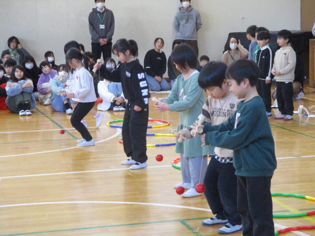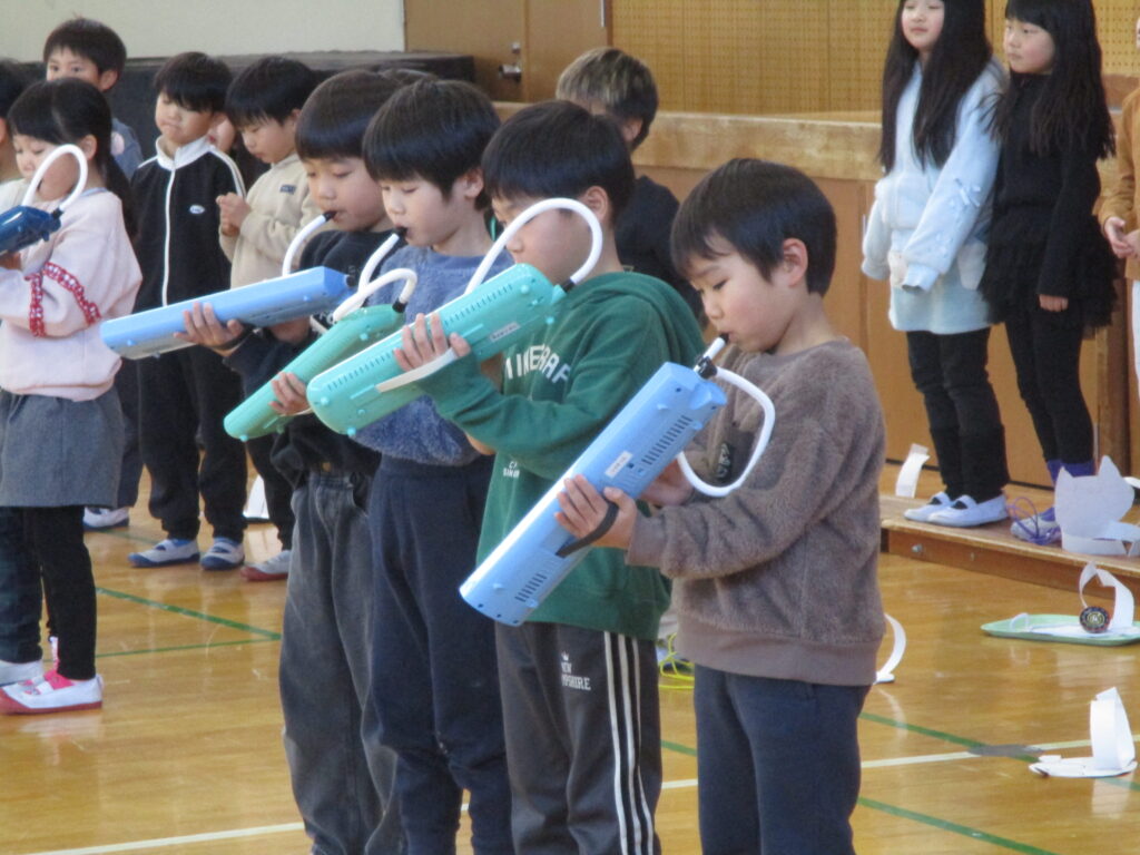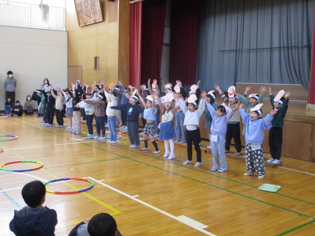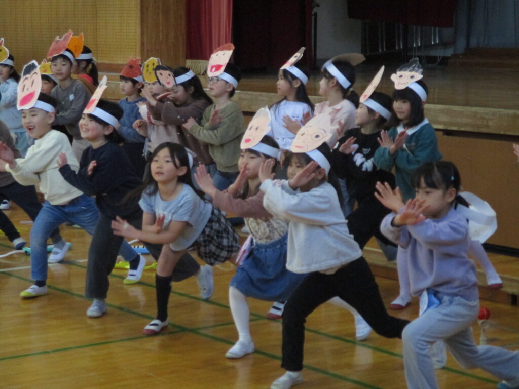 農園ボランティアさんからのご挨拶では、仕事内容のお話の後にクイズが1問出ました。「花や野菜などの植物と皆さんで同じところが1つあります。何でしょう?」すかさず「生きている!」と答えた6年生はさすがでした。「命がある、生きている植物や人間は自分で成長することができるんです。皆さんも成長しながら学校生活を楽しく送ってください。」と熱いエールをいただきました。その後のスマイル集会では、1年生が成長した姿としてコマ・けん玉・縄とび・鍵盤ハーモニカの演奏・フラフープを披露しました。最後の「大きなかぶ」の元気な歌声と愛らしい振り付けで、会場が笑顔で包まれました。