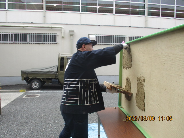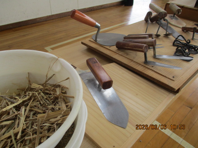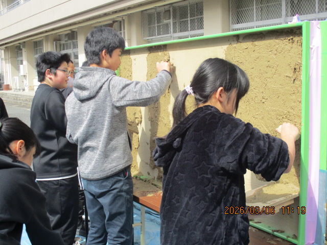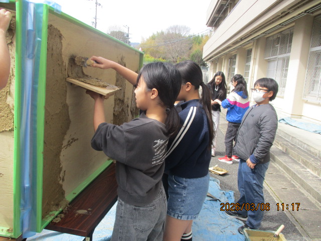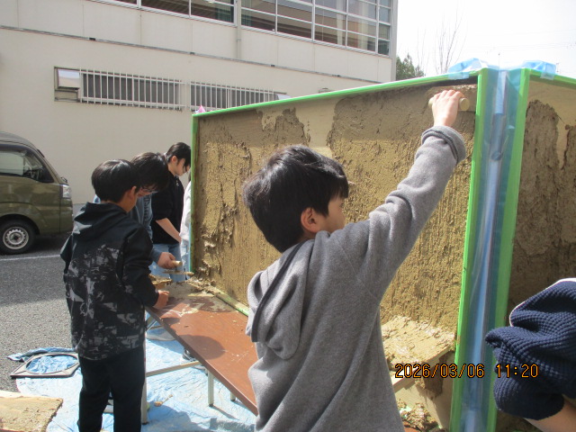 3月6日に6年生が「ぬりかべ体験」をしました。左官職人の三谷涼さんは地元の左官職人です。実際に使っておられるコテや板、土壁のサンプル、土の原料など、工房に置いているものを持参いただき、左官になろうと思った経緯や、厳しい修行を経て今チャレンジしていることなど、熱く語っていただきました。何千年も前からある文化が世界に様々な建造物として残っており、また現在の住宅や公共施設、娯楽施設にも浸透していることを知り、土壁を身近に感じることができました。