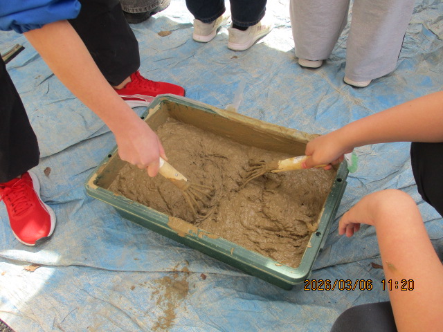 そのあと、外でに出て特別に作っていただいたパネル板に、一晩寝かせた「泥土」を塗る体験をしました。お手本を見せていただいたのですが、出来上がりの美しさに圧倒された子ども達でした。思うように塗れずに苦戦しつつも、「協力して完成させる」というお題を見事達成できました。自分の信念を貫きこの道を突き進む三谷さんがとてもかっこよく、「師匠!」と呼びながらコツを学ぶ様子が見られました。