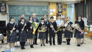 最近の学校の様子 吹奏楽部(管打八重奏)激励会 本日、長岡京市長 中小路 健吾 様、長岡京市議会議長 上村 真造 様、長岡京市教育委員会教育長 西村 文則 様が本校の吹奏楽部(管打八重奏)を激励するために、来校されました。吹奏楽部(管打八重奏)は京都府アンサンブルコンテストにて金賞を受... 2026.02.02 最近の学校の様子