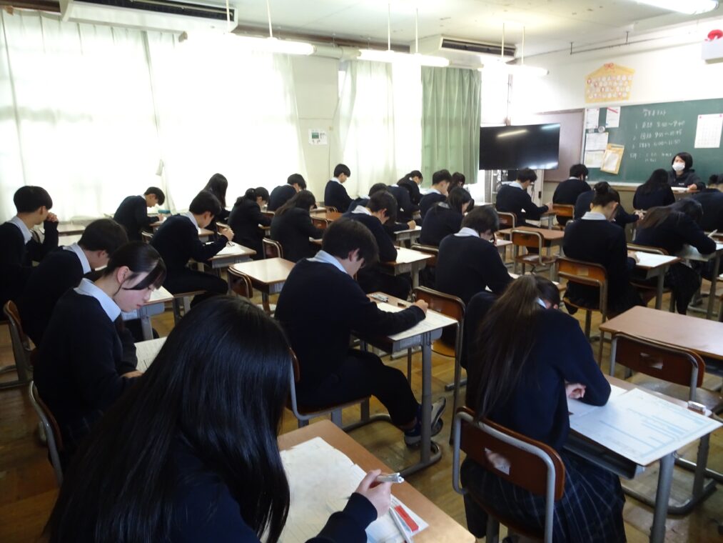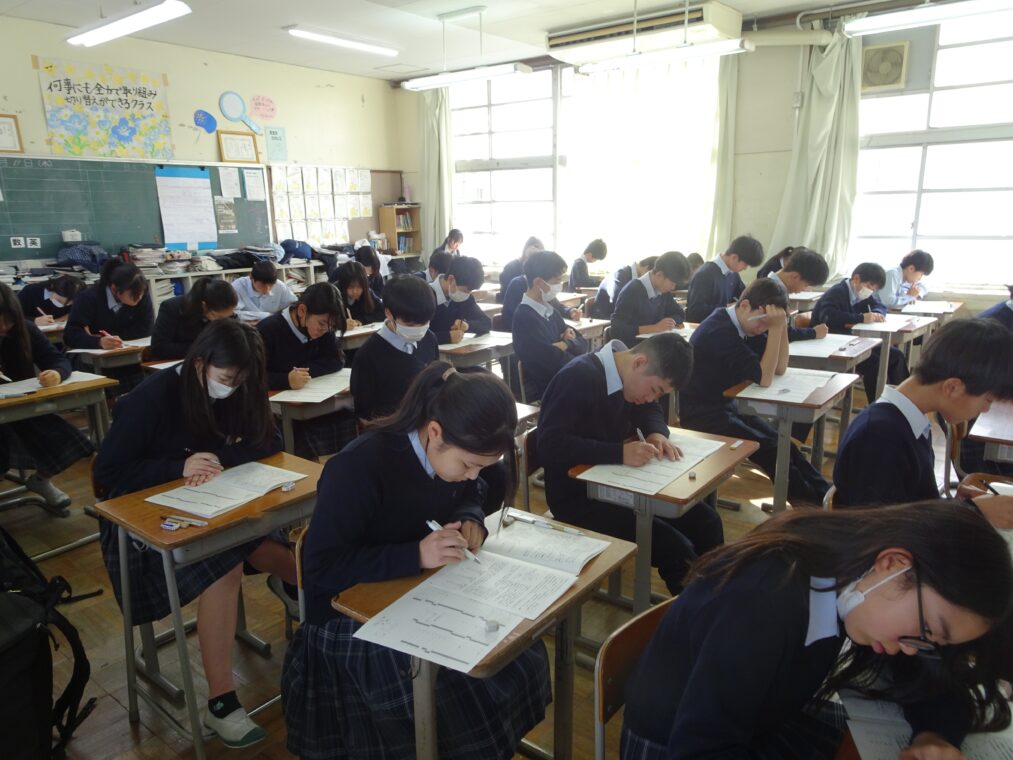 最近の学校の様子本日と明日は3学期期末(学年末)テストです。一年を締めくくる大切なテストです。1、2年生は次年度へとつなげられるように全力で取り組みましょう。3年生にとっては中学校生活最後のテストとなります。受検の真っ只中で忙しい日々を過ごしていることと思いますが、進路先が決まるということと同時に中学校生活の終わりが見えてくるということです。中学校での学習について、しっかりと振り返り、進路先での生活に役立ててください。