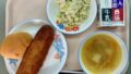 今日の給食は、ごはん、かしわのこはく揚げ、ピリ辛センイ、いとこ汁、牛乳でした。
