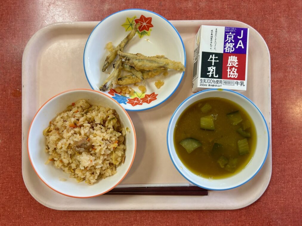 今日の給食は、豚キムチご飯、牛乳、きびなごのチーズ揚げ、いとこ汁でした。