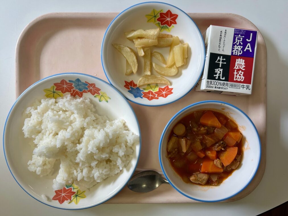 この日の給食は、10月の万博献立 アメリカ合衆国のチキンガンボ、フライドポテト、牛乳でした。