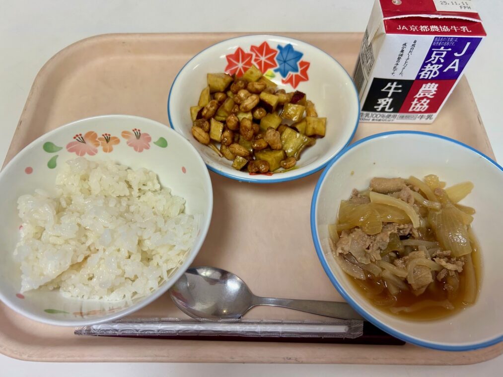 この日の給食は、豚丼、牛乳、さつまいもと大豆の揚げ煮でした。