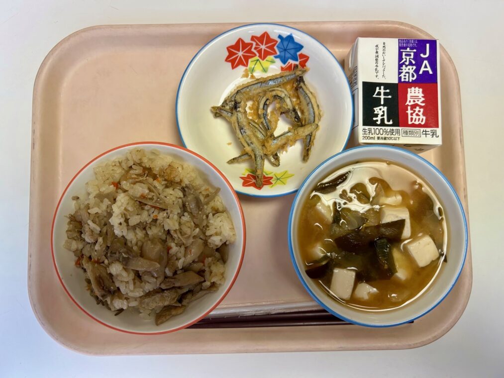 この日の給食は、舞茸ごはん、牛乳、きびなごのチーズ揚げ、きゃべつのみそ汁でした。