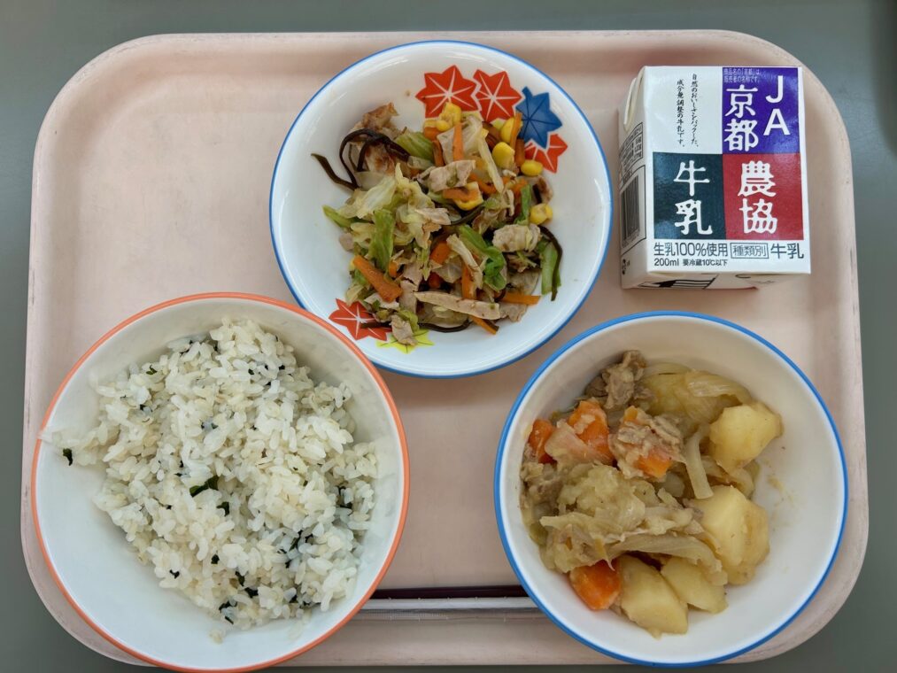 この日の給食は、わかめごはん、牛乳、肉じゃが、元気サラダでした。