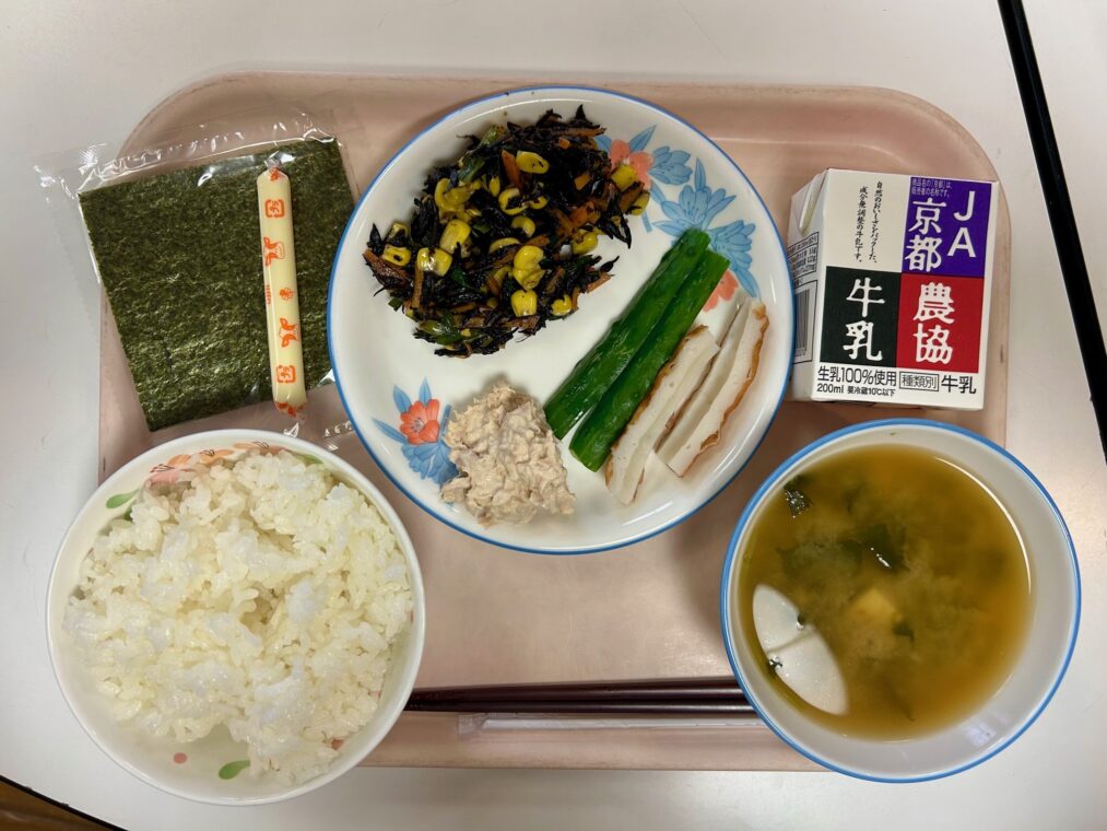 この日の給食は、手巻き寿司、牛乳、ひじきのソテー、あおさのみそ汁でした。