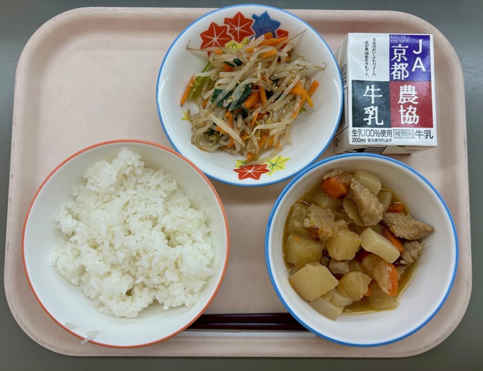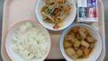 この日の給食は、ごはん、牛乳、大根と豚肉の煮つけ、三色野菜のナムルでした。