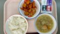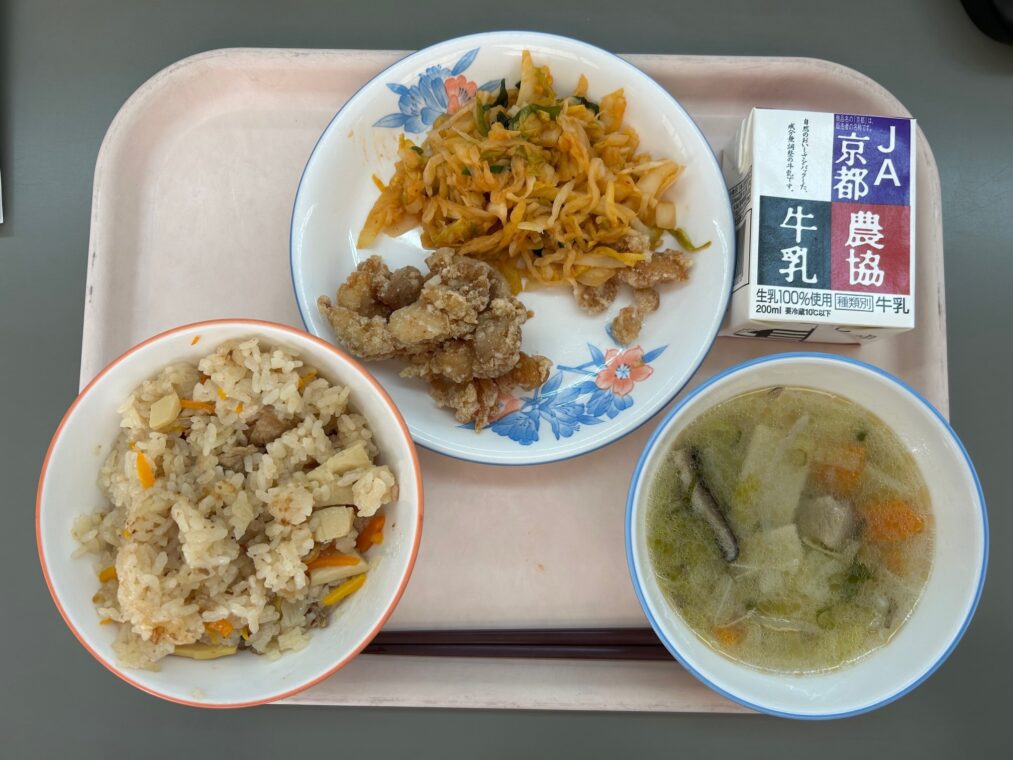この日の給食は、中華おこわ、牛乳、こはく揚げ、はりはりキムチ、ワンタンスープでした。