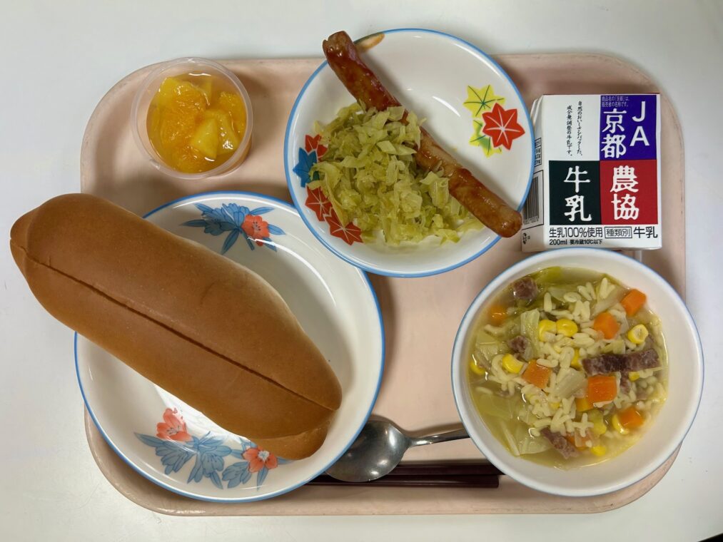 この日の給食は、セルフサンド(ホットドッグ)、牛乳、ABCスープ、フルーツポンチでした。