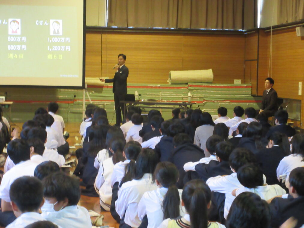 10月23日(木)、2年生を対象としたキャリア学習の一環として、ソニー生命保険株式会社より 小西 淳一 様 と 絹傘 新 様 を講師にお迎えし、「人生を豊かにする金融知識」をテーマにご講演いただきました。