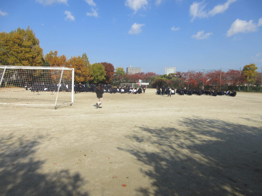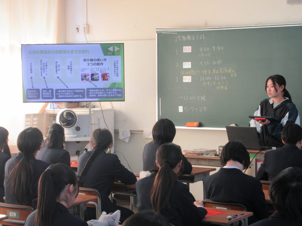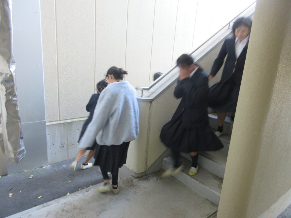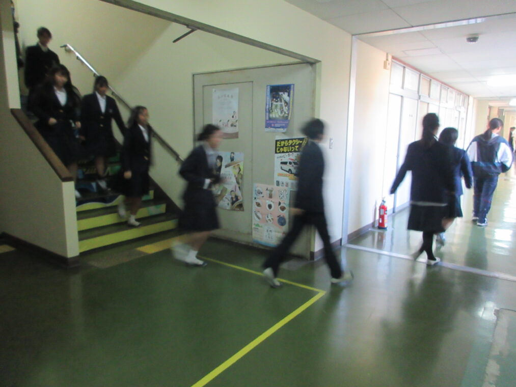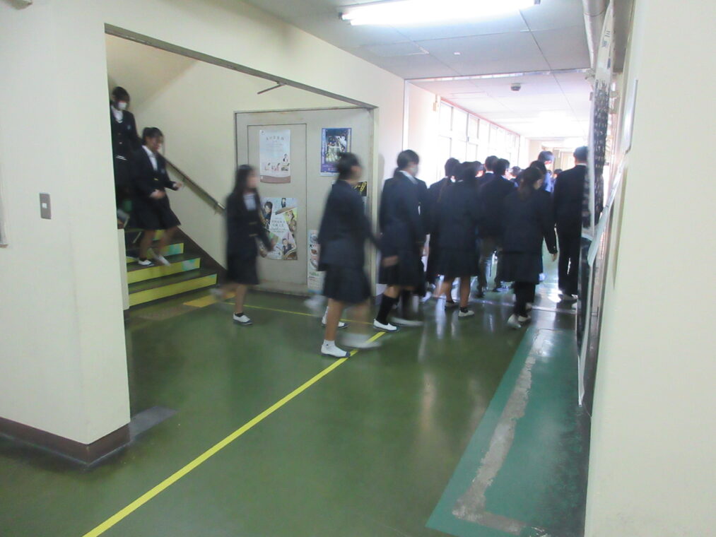 これまで本校では、学活の時間を使ってHR教室から避難する訓練が多く行われてきましたが、今回はより実際に近づけるため、教科の授業中を想定した訓練を実施しました。教科担当の先生の指示のもと、授業によってはHR教室以外の教室から避難する場面もあり、いつも以上に緊張感をもって取り組むことができました。