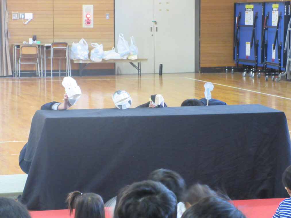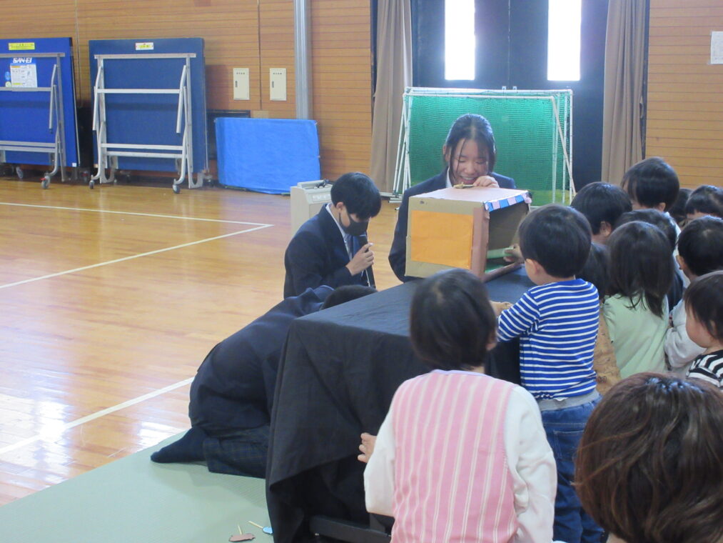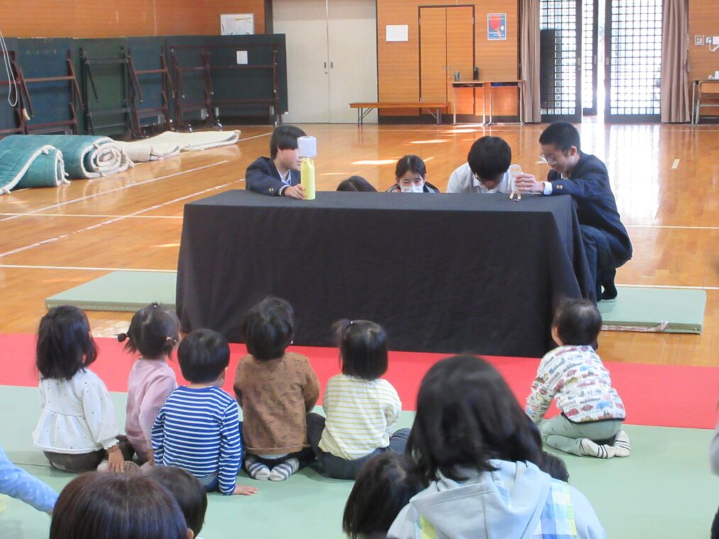 3年3組の生徒は、授業で制作したオリジナルの紙芝居をグループごとに発表。園児たちは興味津々で耳を傾け、物語に合わせて楽しそうに反応してくれました。生徒たちも「伝える楽しさ」を実感し、充実した時間となりました。