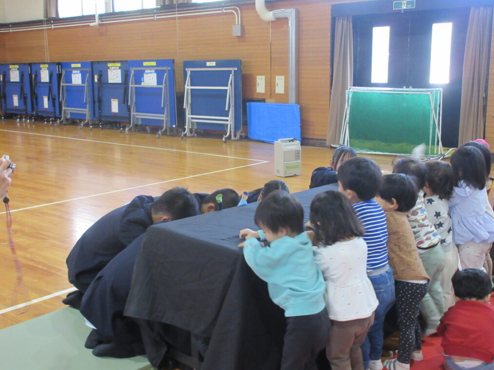 今年も株式会社せきゅりてぃー・ぶらんけっとが運営する保育園の園児の皆さんに来ていただき、生徒たちは緊張しながらも笑顔で交流しました。