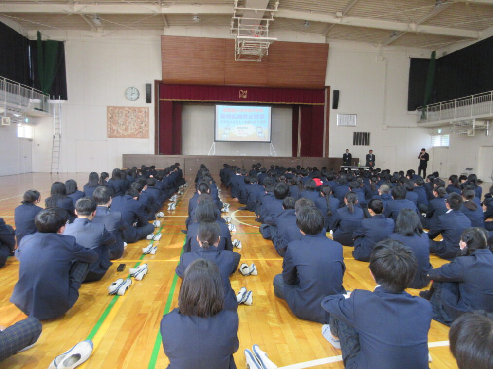 12月11日(木)、6時間目に3年生を対象とした「薬物乱用防止教室」を開催しました。講師には、向日町警察署少年課スクールサポーターの山口卓司様をお迎えし、薬物の危険性や誘惑を断るための方法についてお話しいただきました。生徒たちは、薬物乱用が身近な問題であることを認識し、その害悪性を理解するとともに、誘惑を排除する力を身につける大切さを学びました。講話中、生徒たちは真剣な表情で耳を傾け、薬物のない健全な生活を送るための意識を高める貴重な機会となりました。