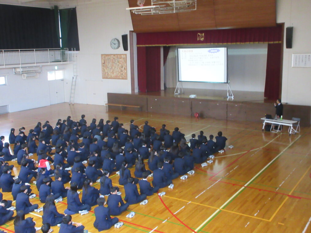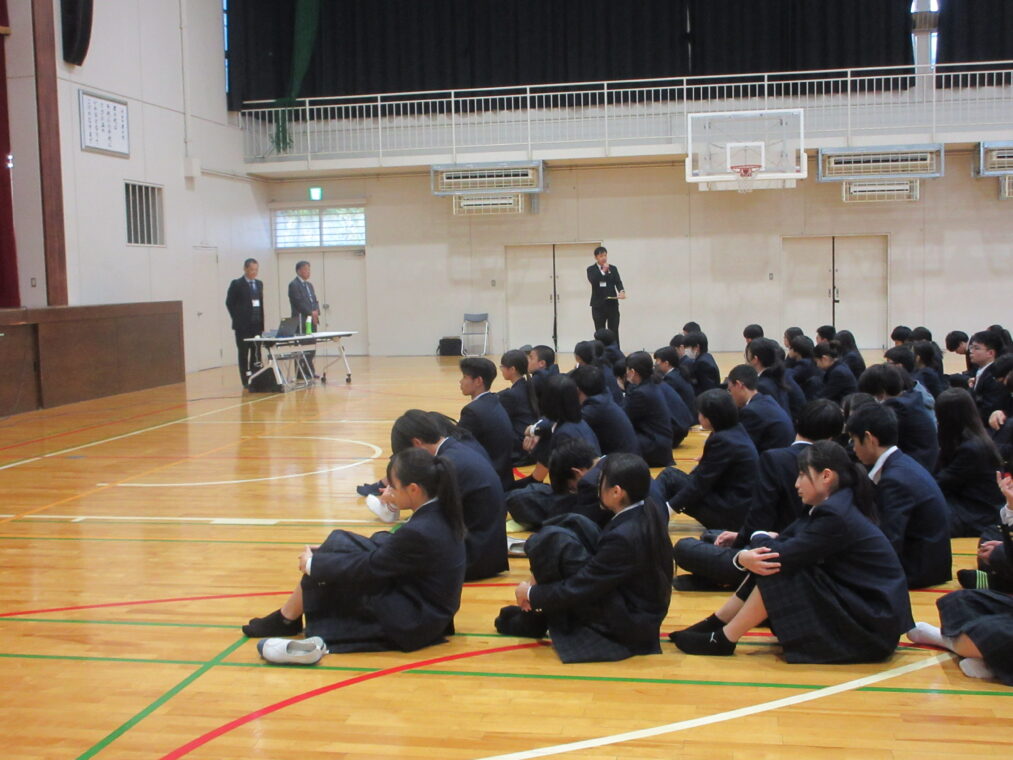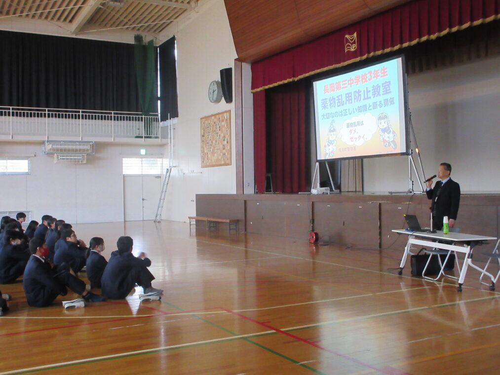 学校の様子12月11日(木)、6時間目に3年生を対象とした「薬物乱用防止教室」を開催しました。講師には、向日町警察署少年課スクールサポーターの山口卓司様をお迎えし、薬物の危険性や誘惑を断るための方法についてお話しいただきました。生徒たちは、薬物乱用が身近な問題であることを認識し、その害悪性を理解するとともに、誘惑を排除する力を身につける大切さを学びました。講話中、生徒たちは真剣な表情で耳を傾け、薬物のない健全な生活を送るための意識を高める貴重な機会となりました。