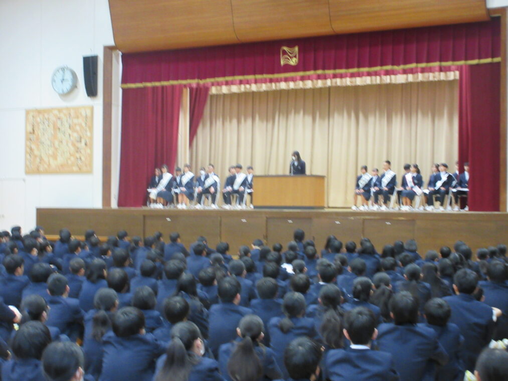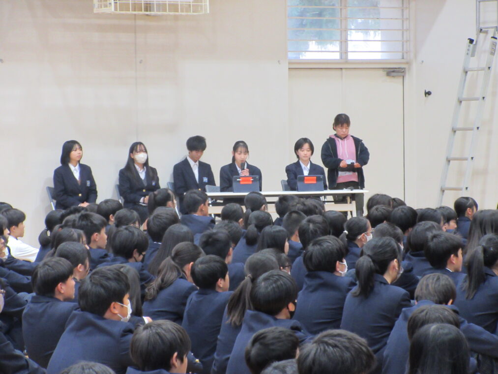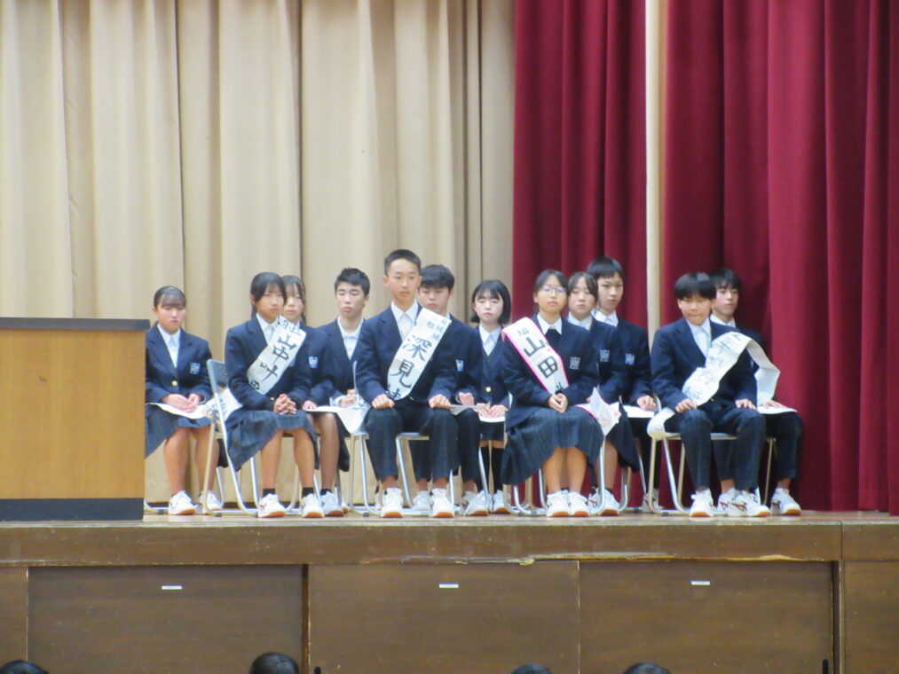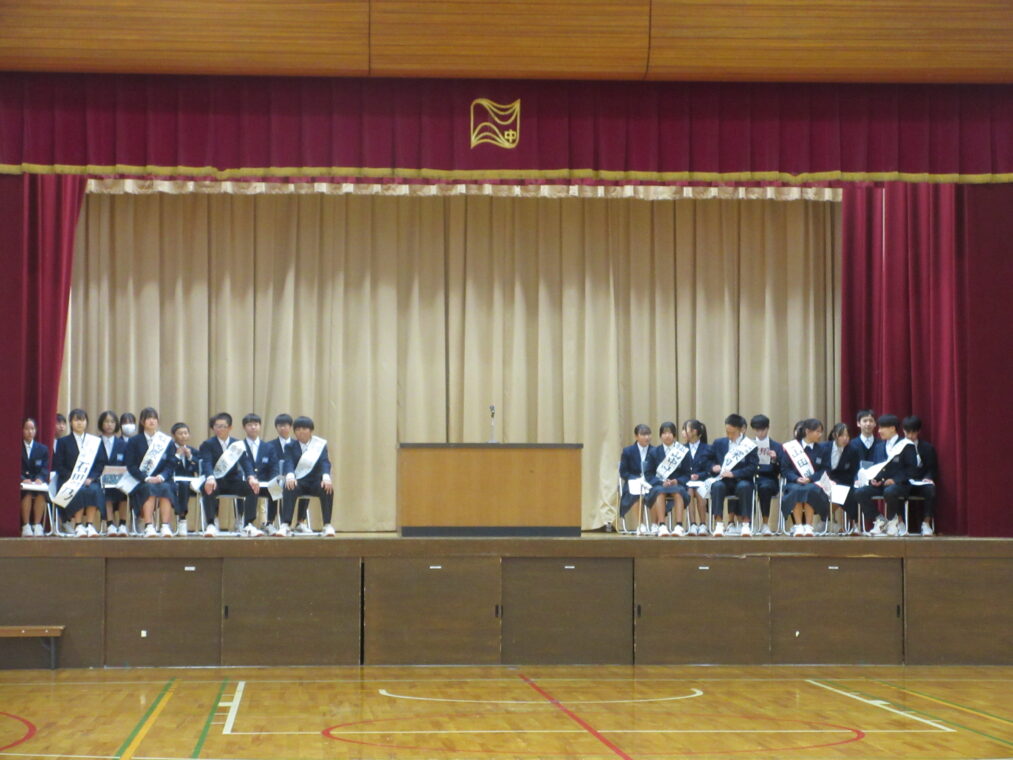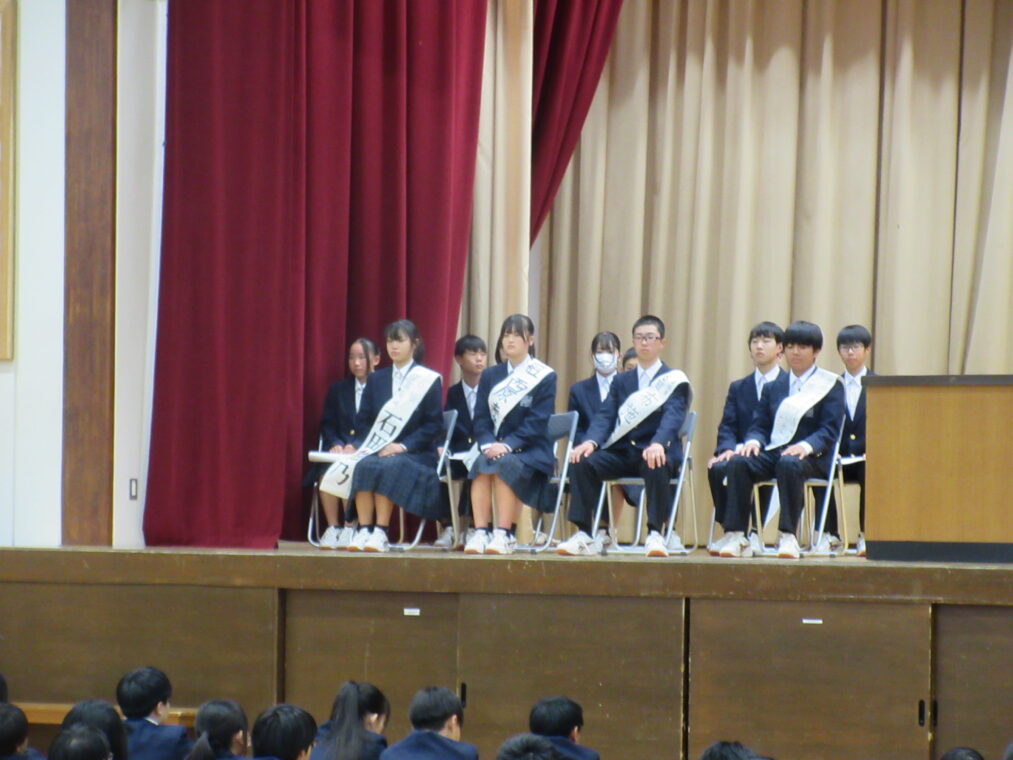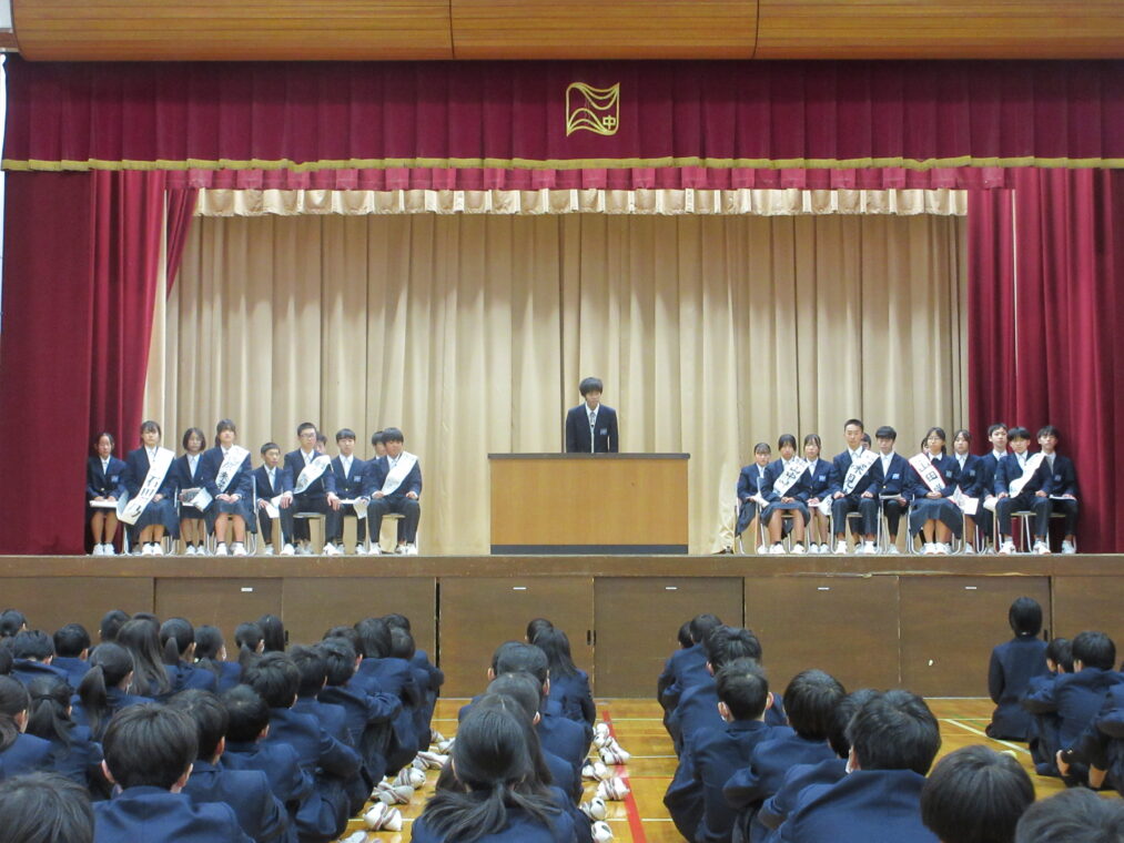 学校の様子 12月12日(金)、6時間目に体育館で生徒会本部役員選挙を行いました。先週からの事前活動では、各学級や放課後の挨拶の場で、候補者たちが自分の決意や公約を堂々と語る姿が印象的でしたが、選挙当日の本番では、その思いがさらに強く込められたスピーチが続き、会場は熱気に包まれました。