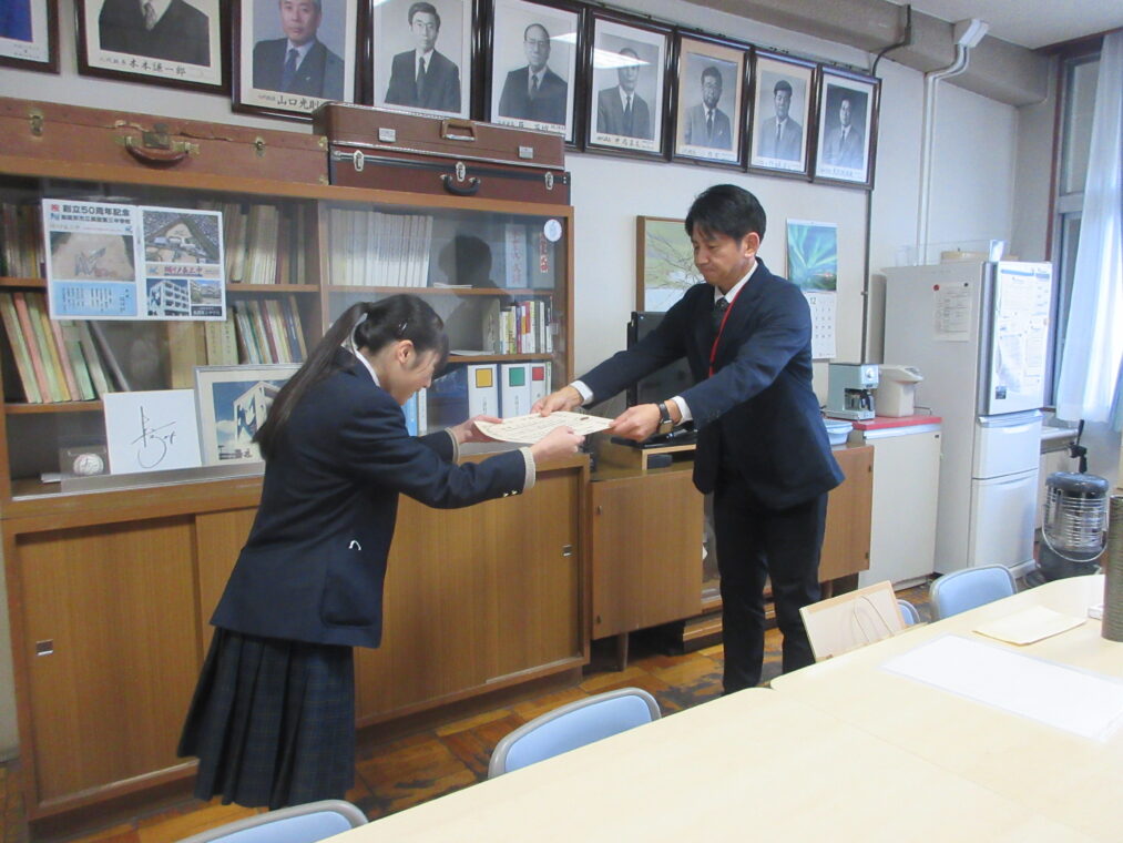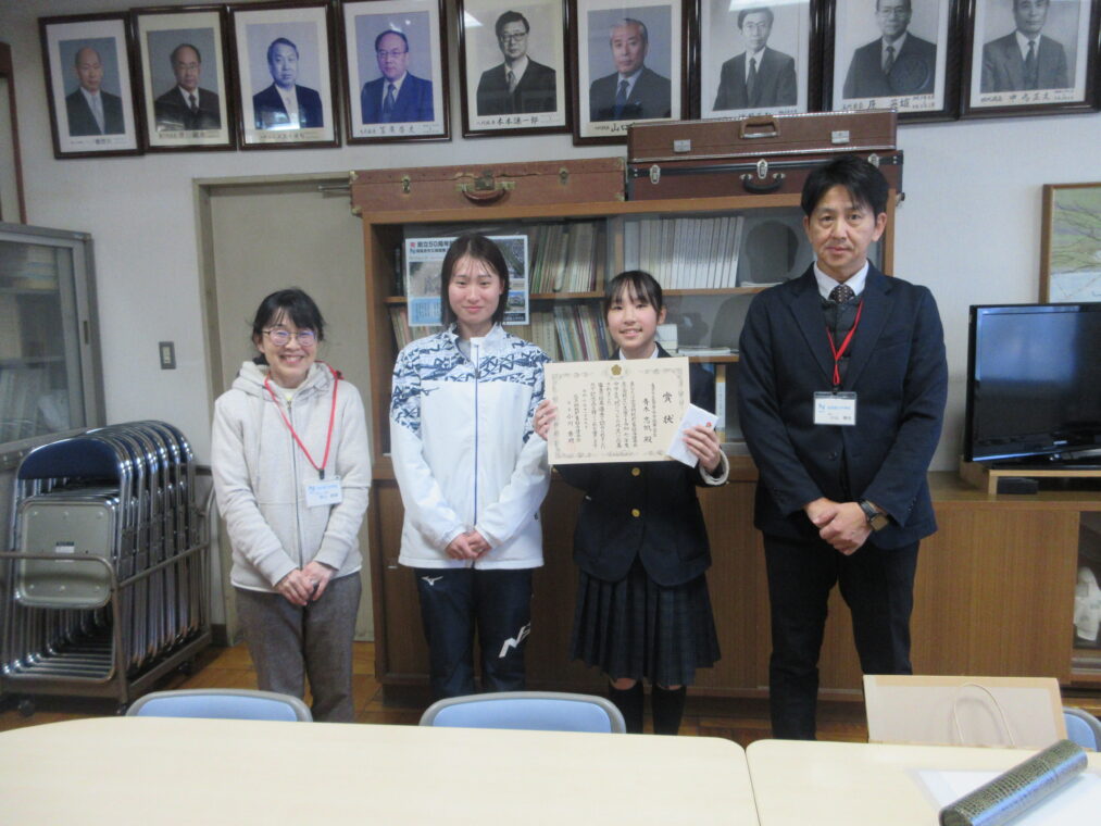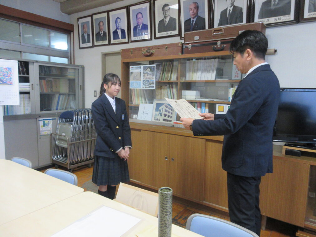 本日、校長室にて、表彰式を行いました。青木さん、おめでとうございます。