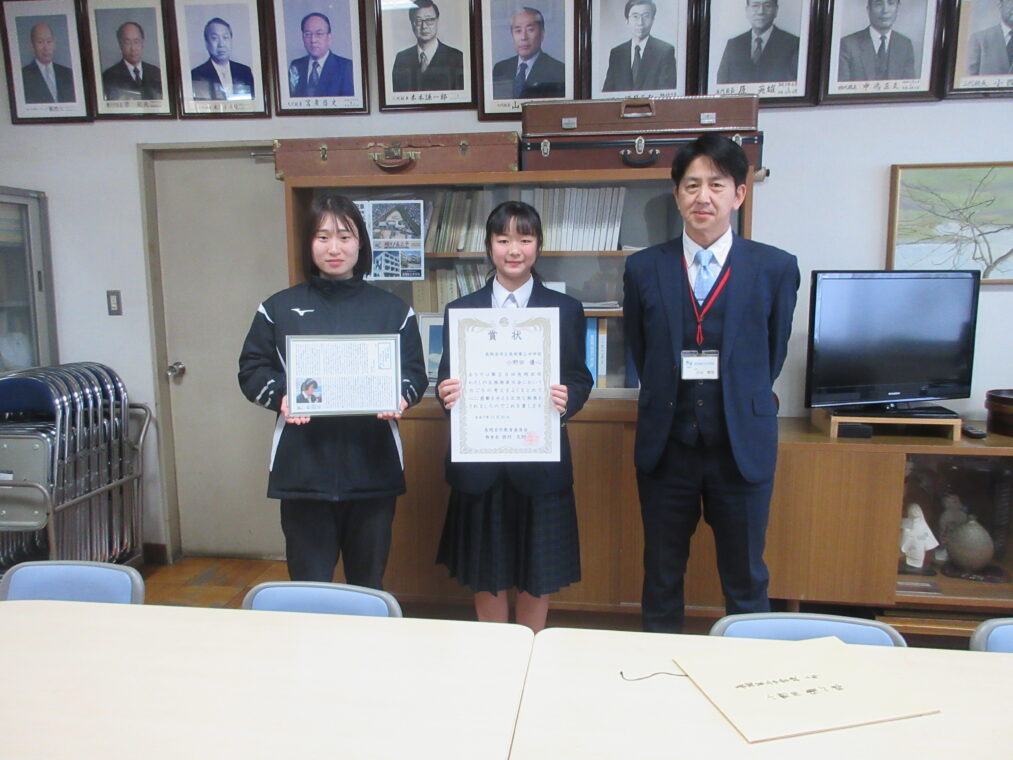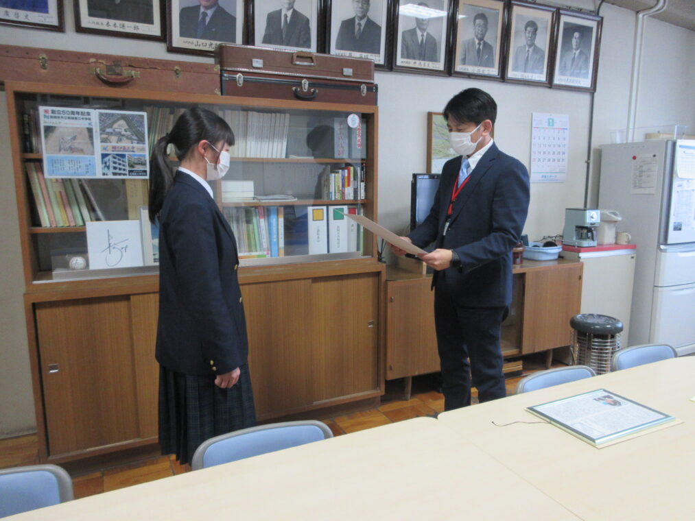 本日、校長室にて表彰式を行いました。小野田さん、おめでとうございます。
