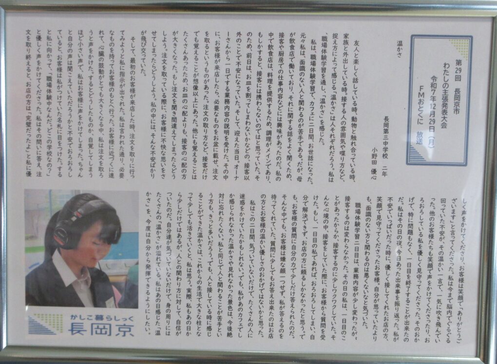 小野田さんは、職場体験を通して学んだ「人との関わりの大切さ」について、自分の言葉で丁寧にまとめ、堂々と発表しました。発表の様子は FMおとくに でも放送されました。