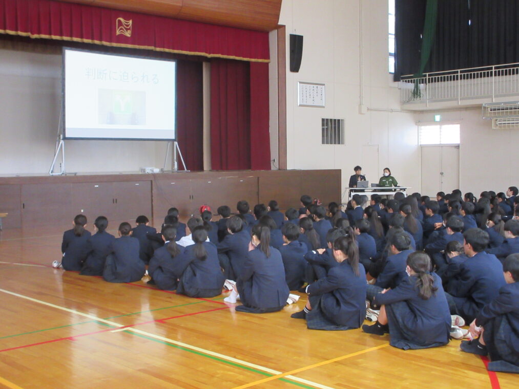 23日(金)6時間目に体育館にて、先週の講演に引き続き、長岡京市社会福祉協議会より 吉岡 祐一 様 を講師にお招きし、防災に関する学習を行いました。
