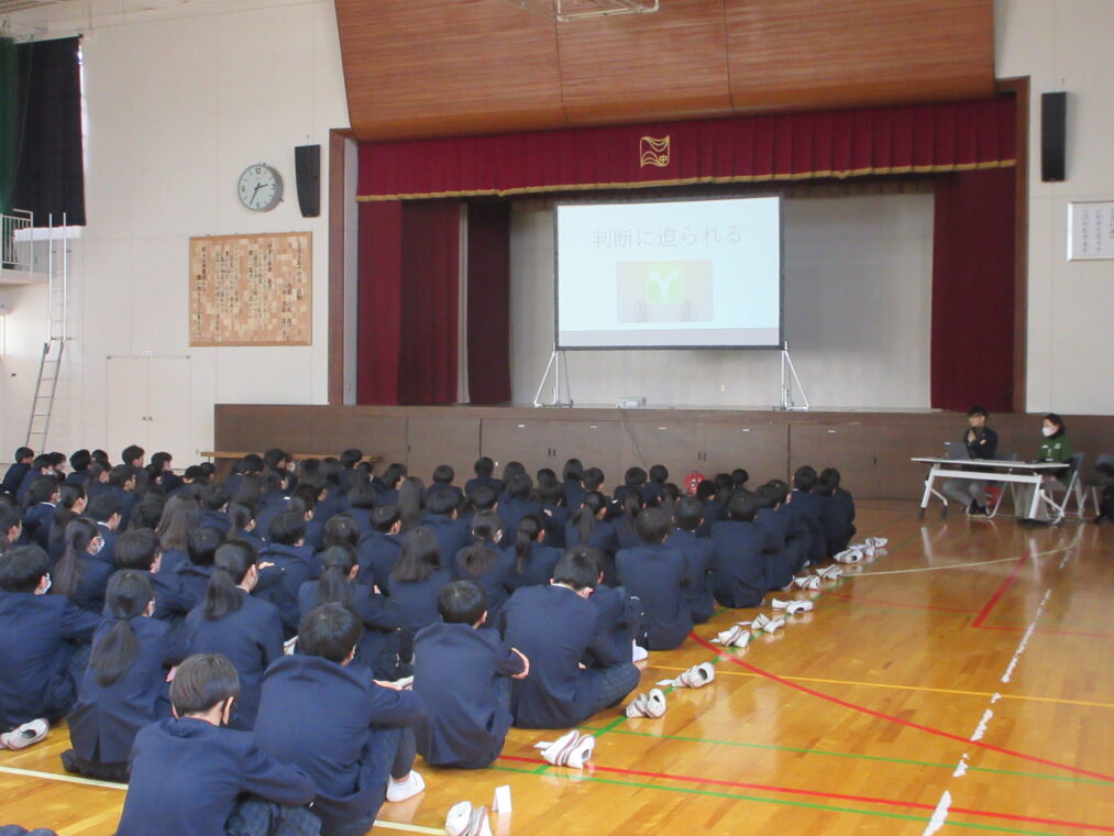 前回の講演後、2年生の生徒たちは、災害時における自宅周辺の危険箇所や安全な場所を調べるとともに、いざという時に本当に必要なものは何かを考える学習に取り組み、本日の活動を迎えました。