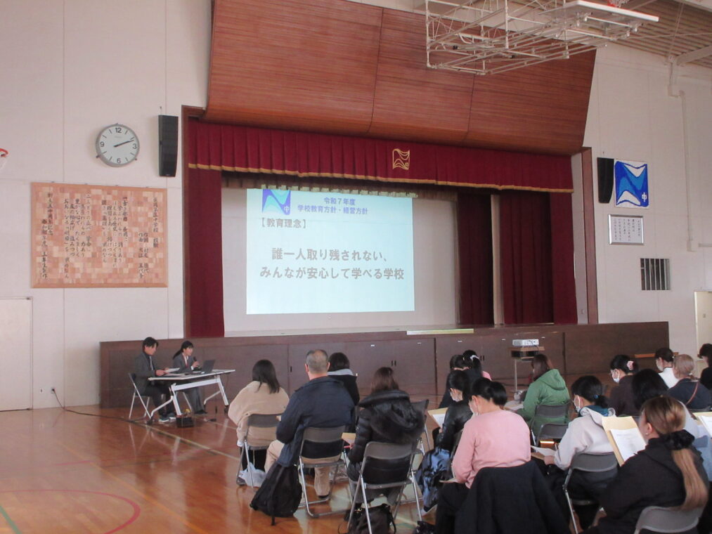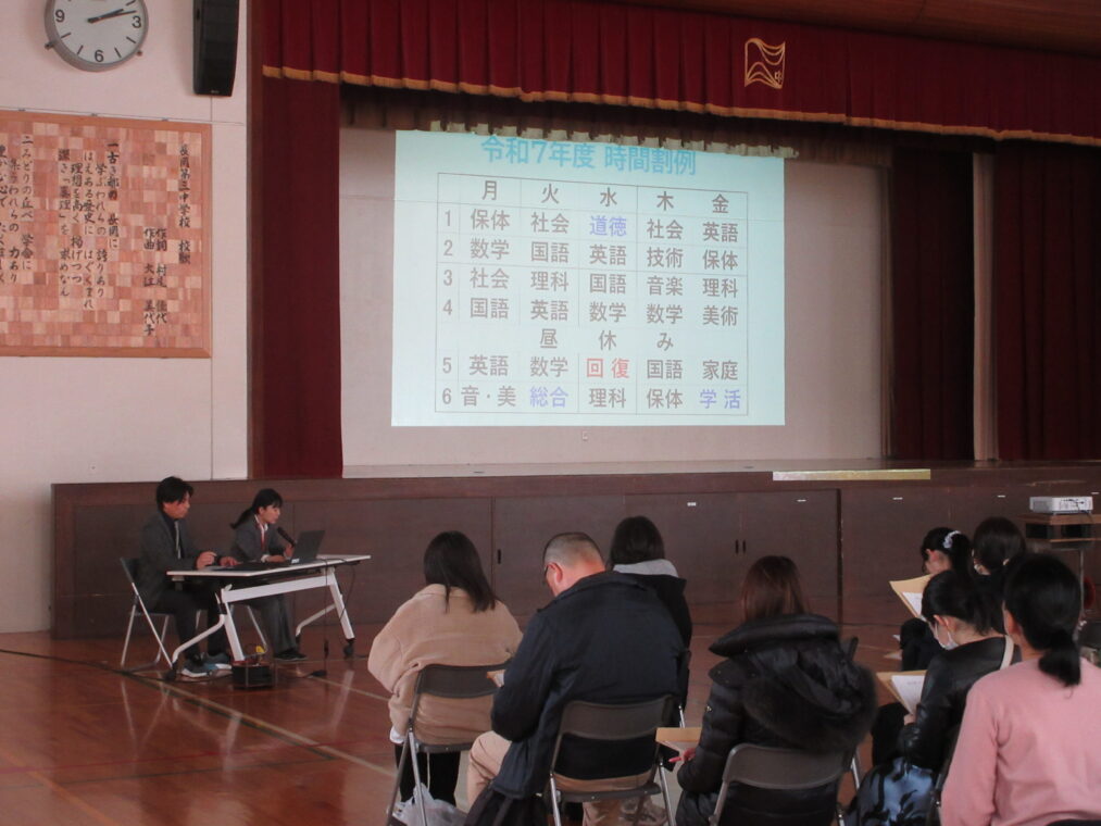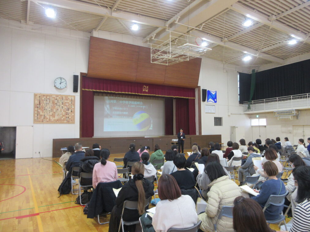 学校の様子 2月2日(月)、本校体育館にて令和8年度新入生保護者説明会を実施しました。校区の小学校を中心に、多くの保護者の皆様にご来校いただきました。