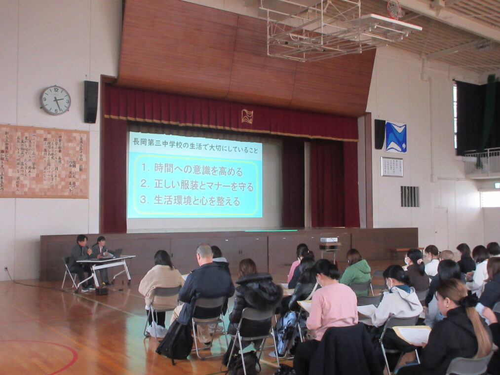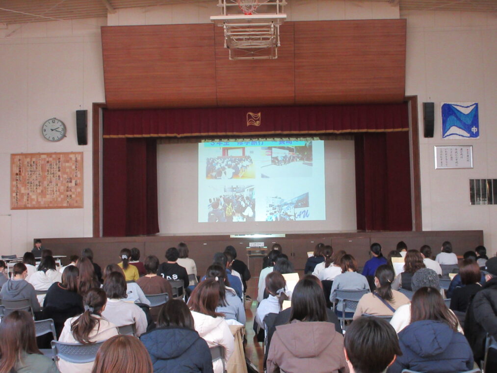 2月2日(月)、本校体育館にて令和8年度新入生保護者説明会を実施しました。校区の小学校を中心に、多くの保護者の皆様にご来校いただきました。
