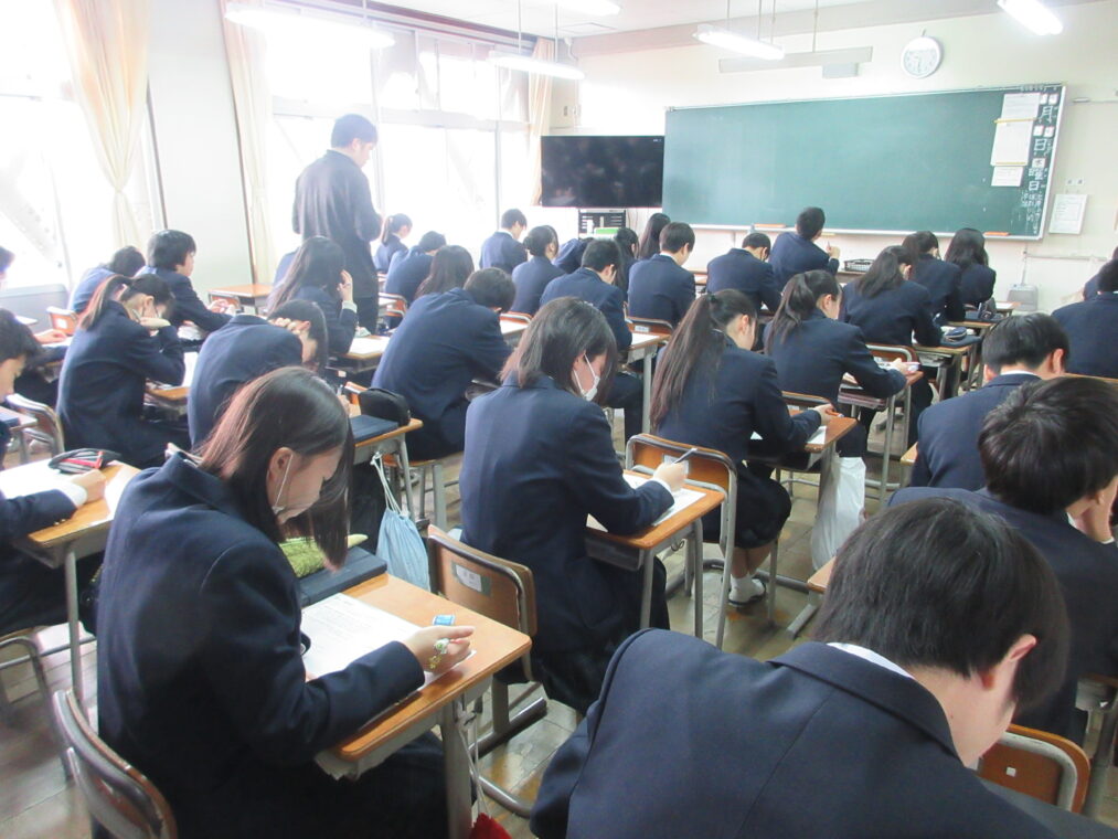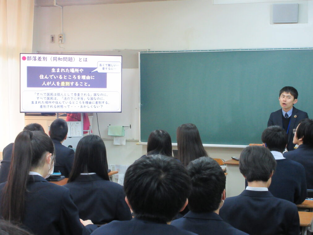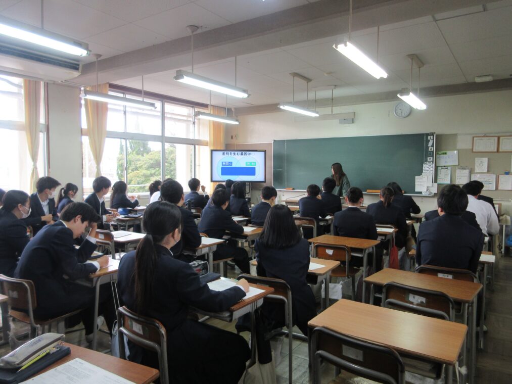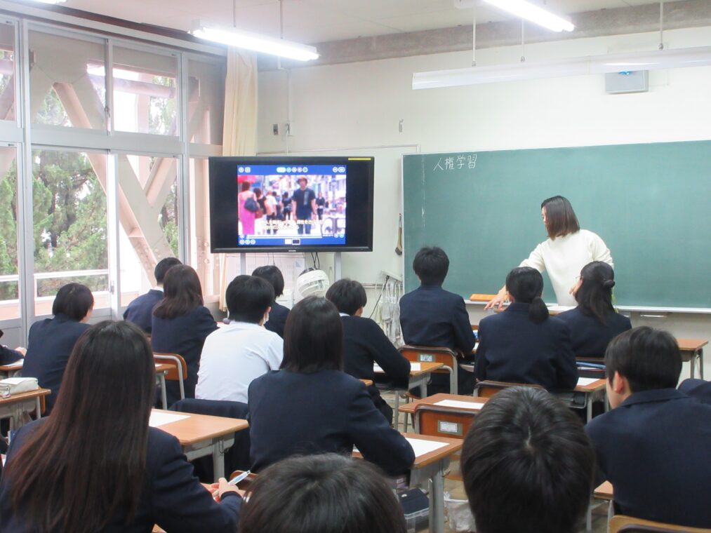 授業では映像教材も活用し、生徒たちが自分自身の課題として人権問題を捉える姿が見られました。ある生徒は、「他人事のように考えるのではなく、自分の中にも差別意識があると気付きました。それを放置せず、正しい知識を身に付けていくことが大切だと思いました」と感想を述べていました。