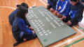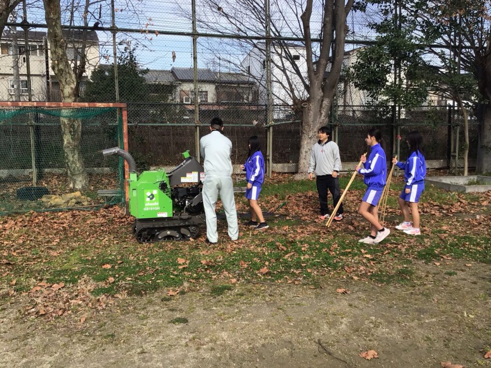 生徒たちは慣れない道具に苦労しながらも、仲間と協力し、楽しそうに作業を進めていました。完成した竹チップはグラウンド北側に敷き詰められ、雑草の発生を抑える効果が期待されています。