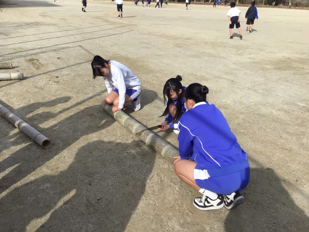 さらに、残った竹を活かし、3年生は卒業制作にも取り組みました。卒業を控えた生徒たちの思いがこもった、温かみのある作品が出来上がりつつあります。