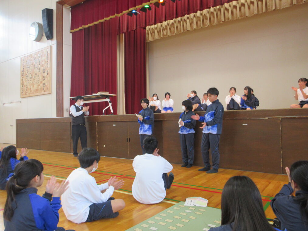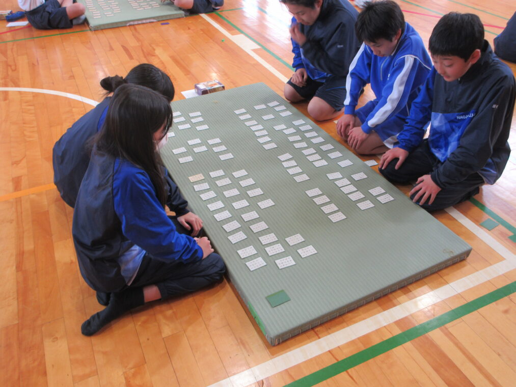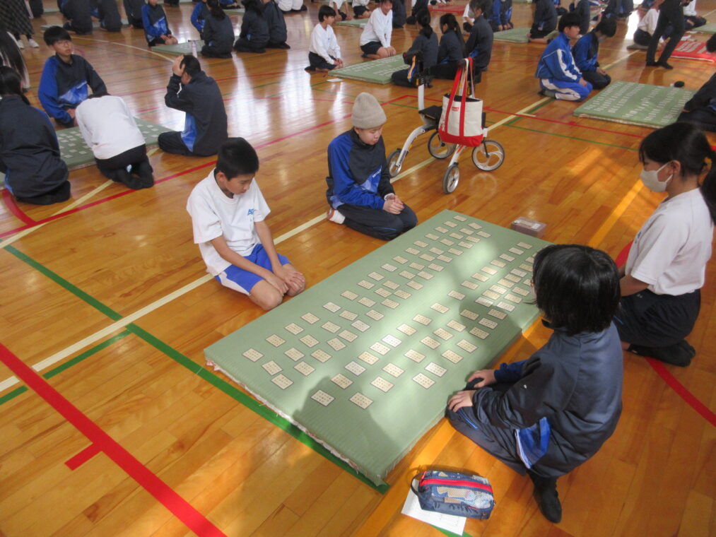 試合が始まると、生徒たちは札の読み上げに集中し、1枚でも多く取ろうと必死に手を伸ばしていました。友だち同士で励まし合ったり、良いプレーには自然と拍手が起こったりと、百人一首ならではの楽しさを味わうことができました。