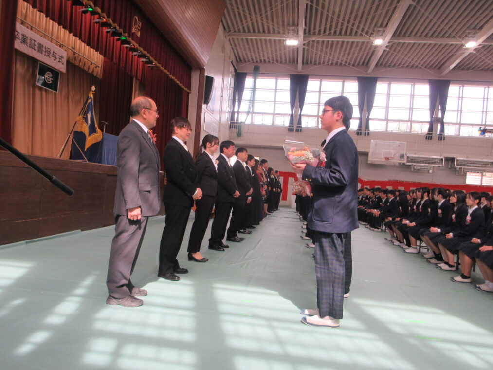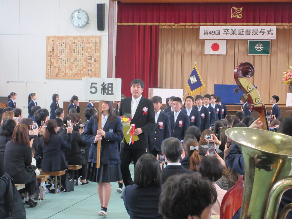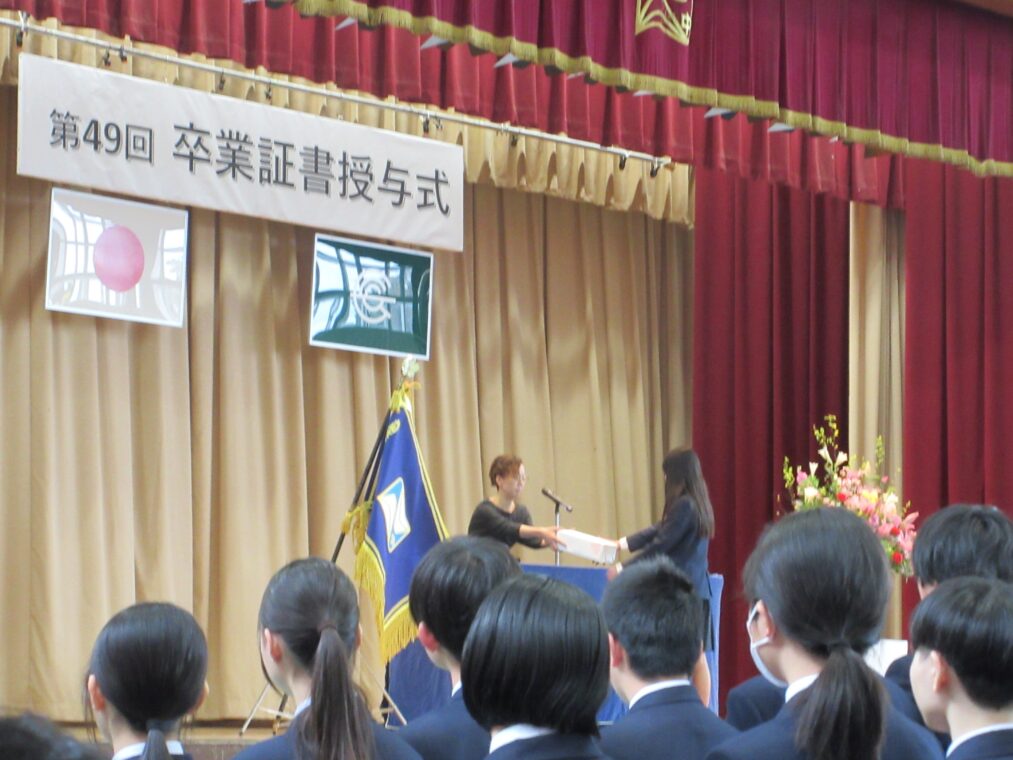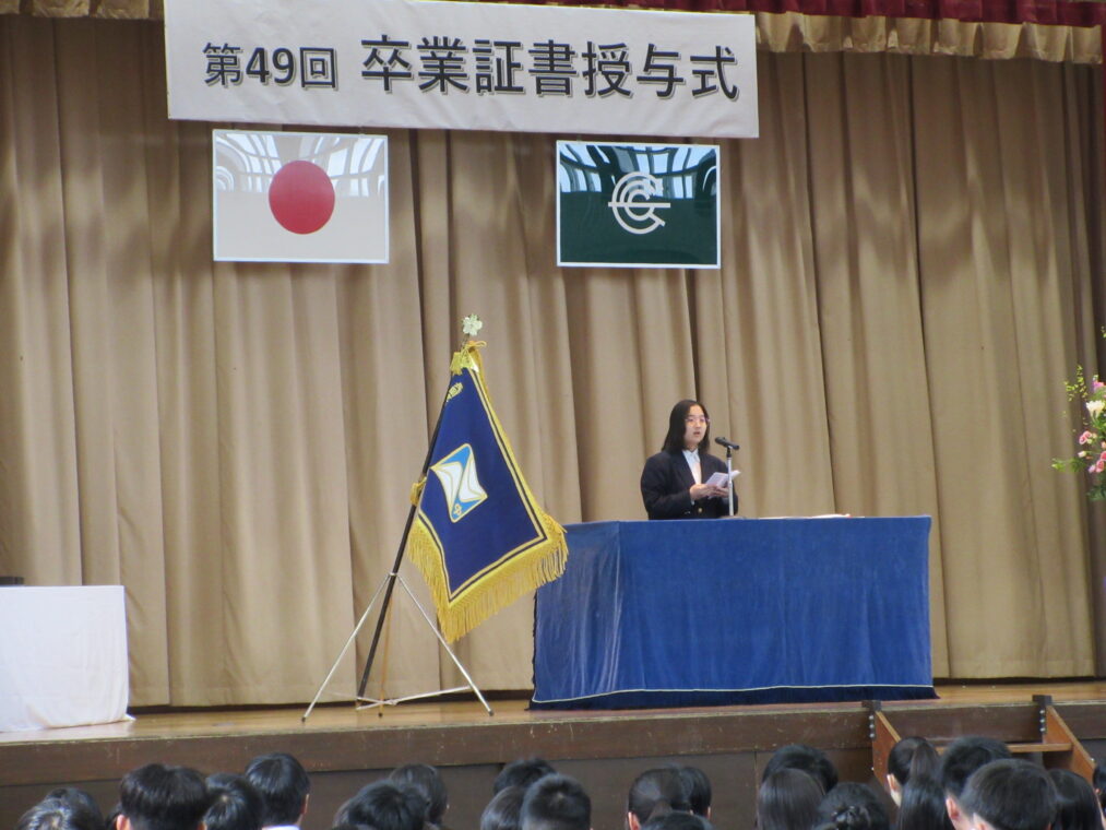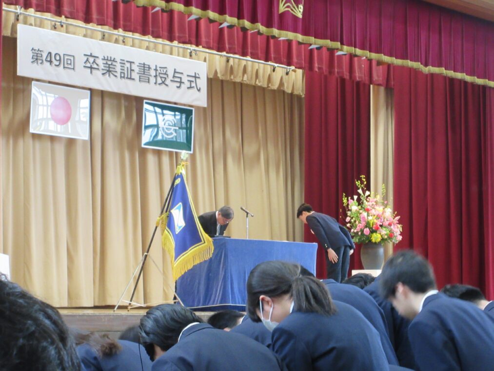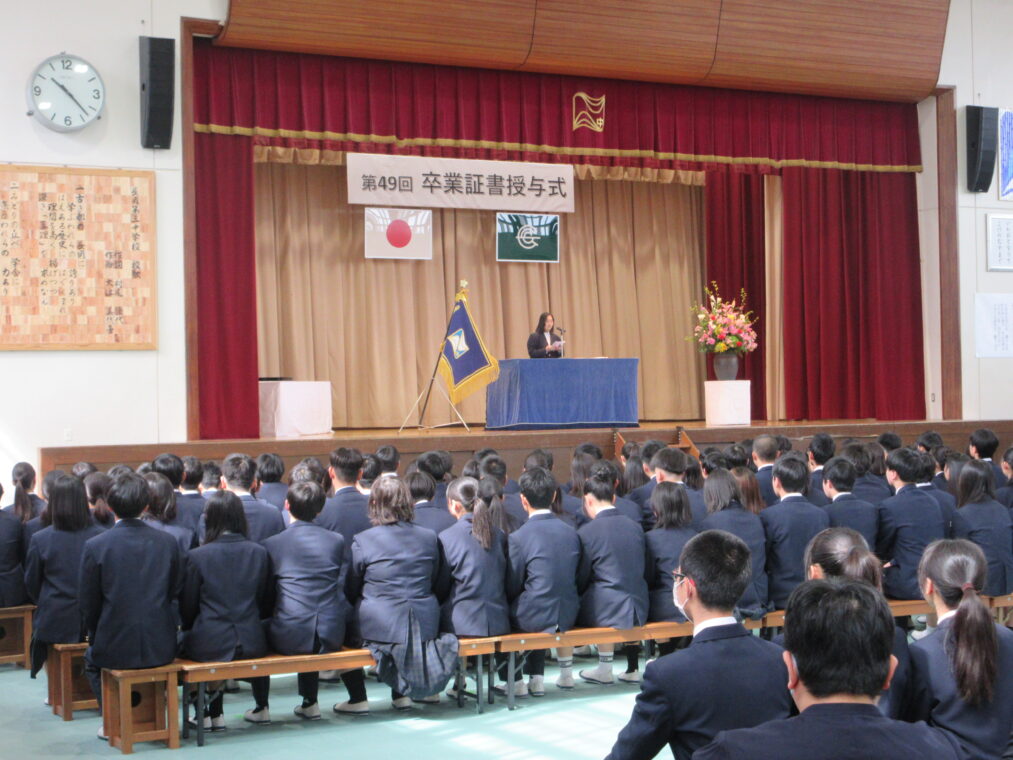 3月13日(金)、冬の名残を感じるひんやりとした空気の中、第49回卒業証書授与式を挙行しました。当日は、西村 文則 長岡京市教育委員会教育長をはじめ多くのご来賓の皆さま、そして多数の保護者の皆さまにご臨席いただき、厳かな雰囲気の中で式を開催することができました。