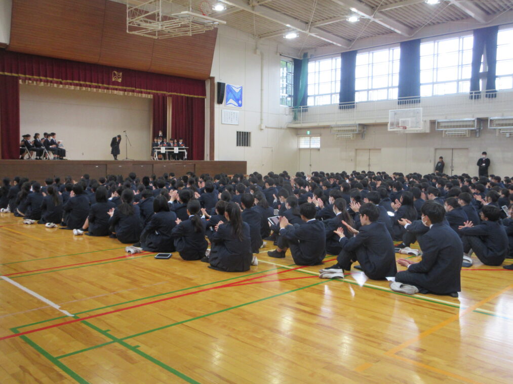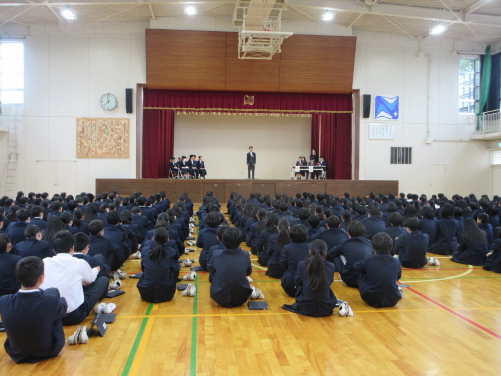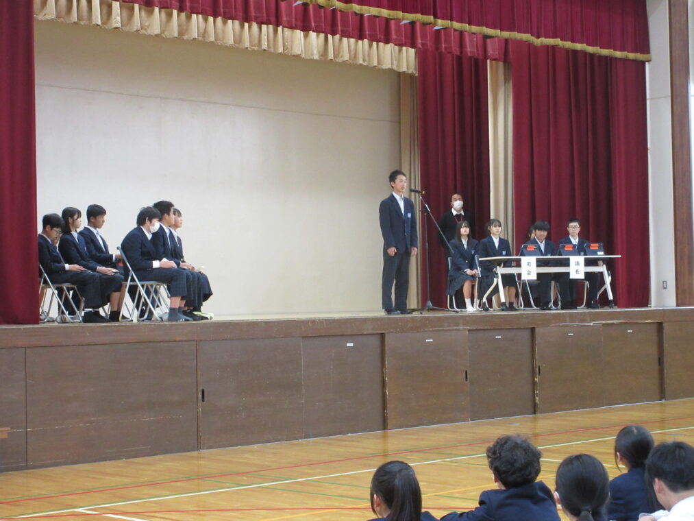 3月18日(水)、体育館にて生徒総会を実施しました。3年生が卒業し、1・2年生だけで臨む初めての総会でした。各学年の代議員が1年間の取組を報告した後、各委員会の委員長からも、この1年間の活動について総括が述べられました。生徒たちは発表にしっかりと耳を傾け、委員長たちも堂々とした態度で分かりやすく発表することができました。司会進行は生徒会本部役員が担当し、落ち着いた運営で立派に総会を進行しました。