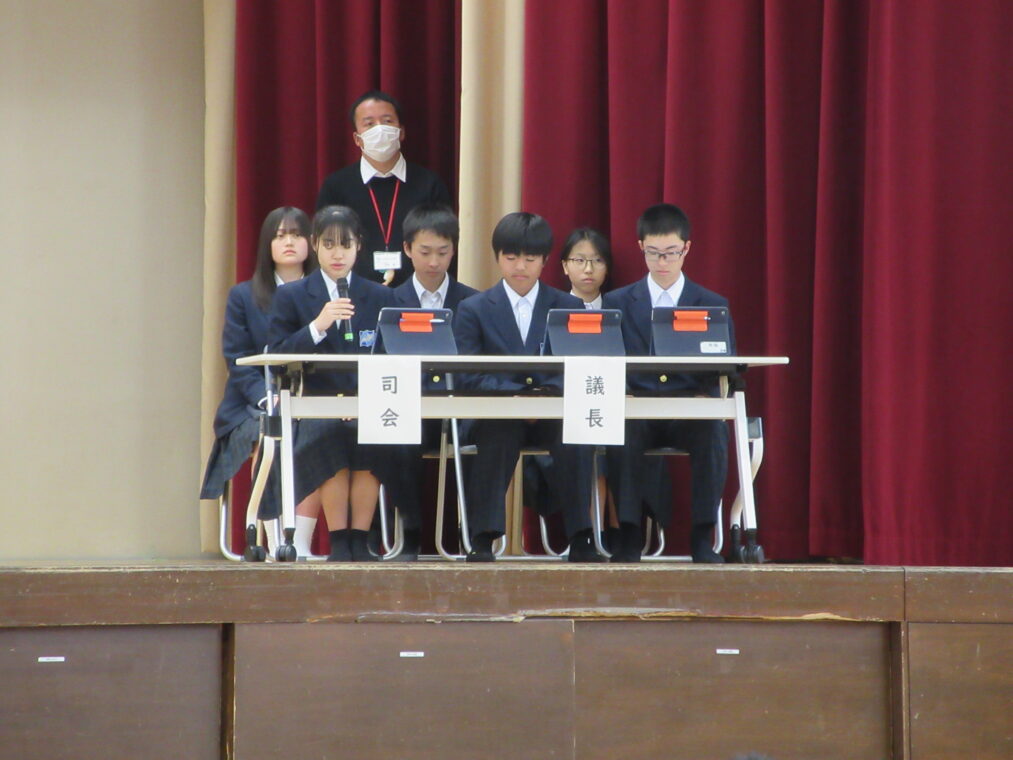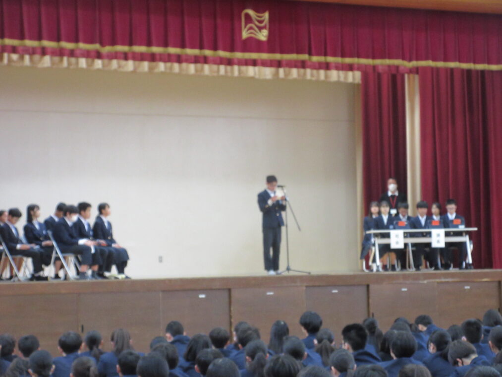 学校の様子3月18日(水)、体育館にて生徒総会を実施しました。3年生が卒業し、1・2年生だけで臨む初めての総会でした。各学年の代議員が1年間の取組を報告した後、各委員会の委員長からも、この1年間の活動について総括が述べられました。生徒たちは発表にしっかりと耳を傾け、委員長たちも堂々とした態度で分かりやすく発表することができました。司会進行は生徒会本部役員が担当し、落ち着いた運営で立派に総会を進行しました。