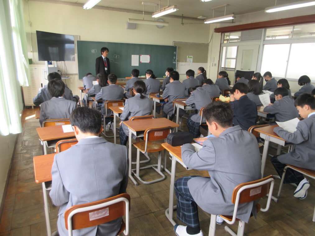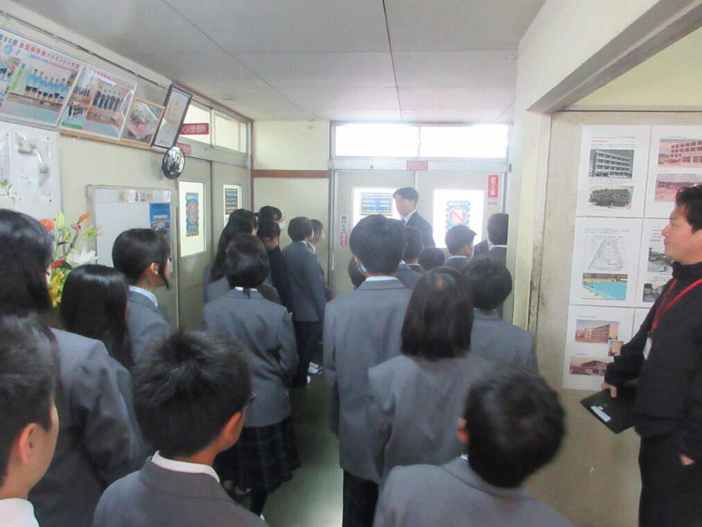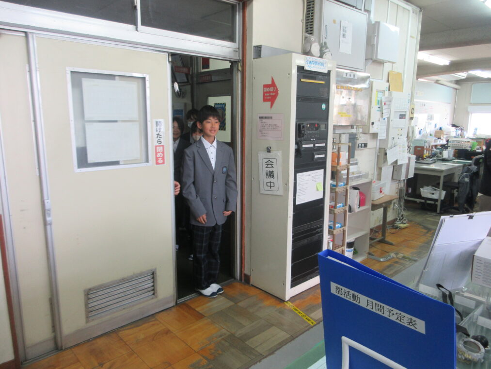 1年生は校舎見学を行い、長三中の校舎内を歩きながら、一つ一つの場所について担任の先生から説明を受けました。職員室では正しい入室方法を教えていただき、代表の生徒が実際に練習を行いました。