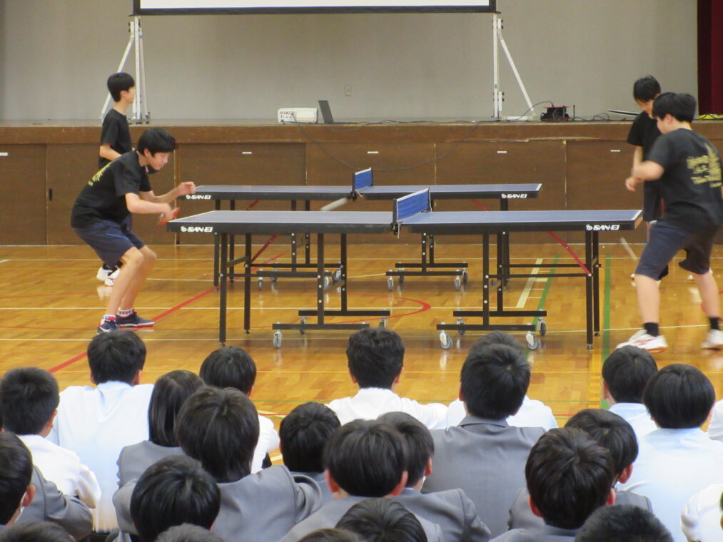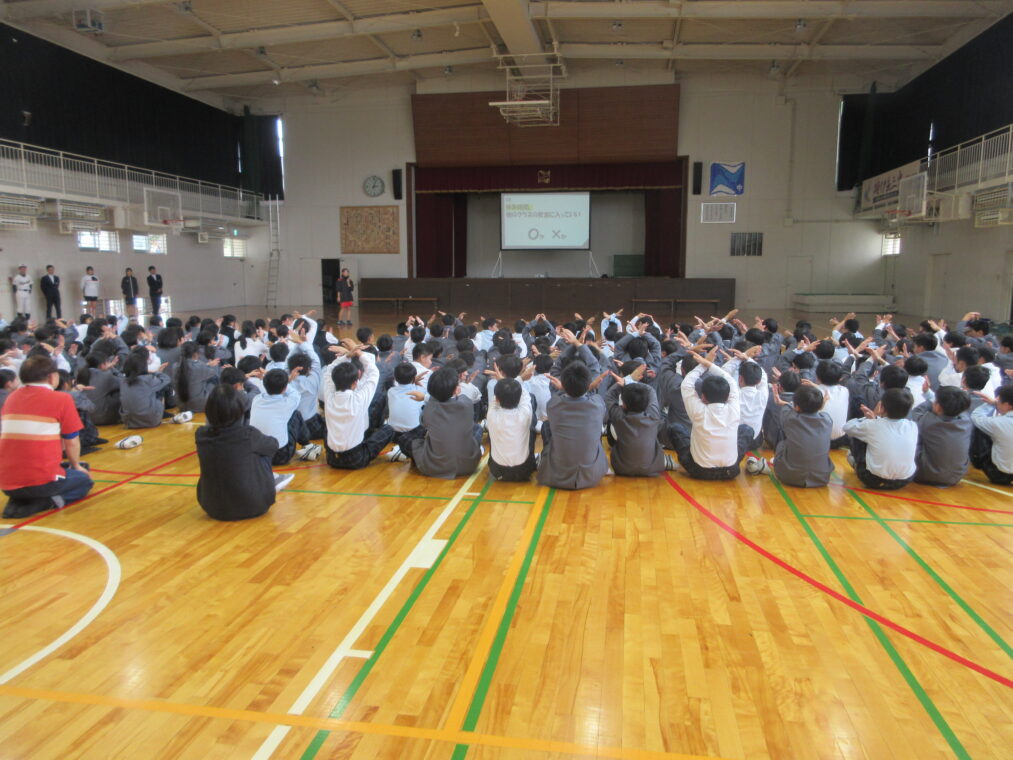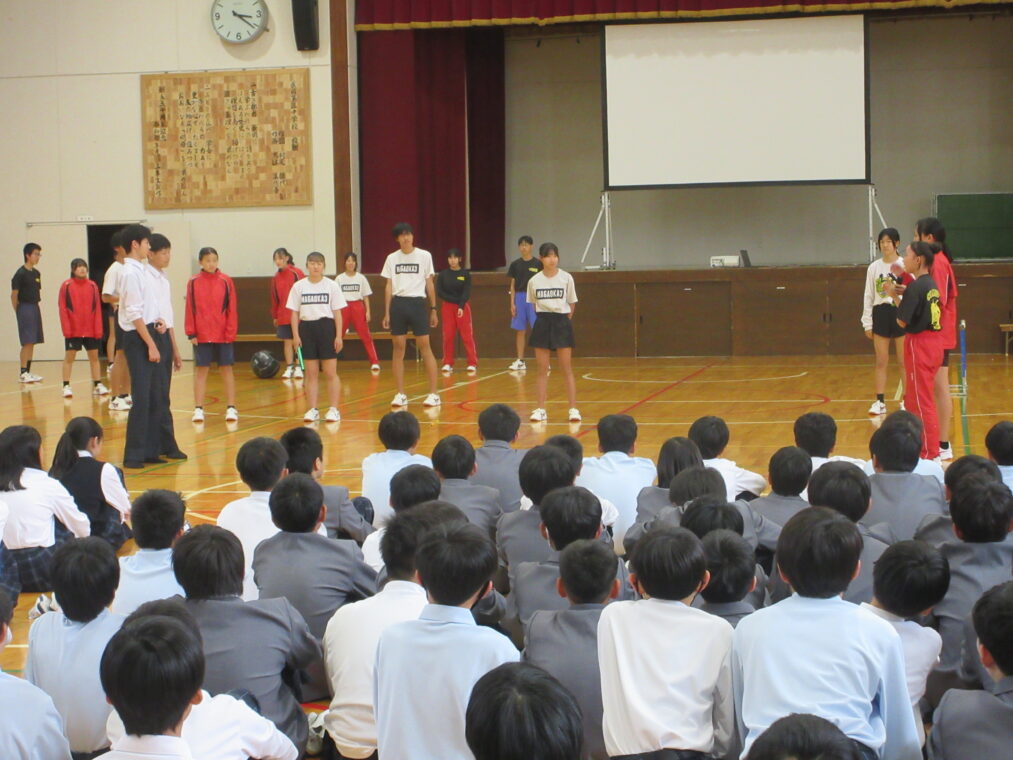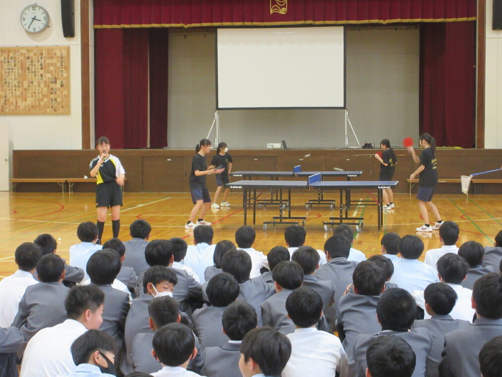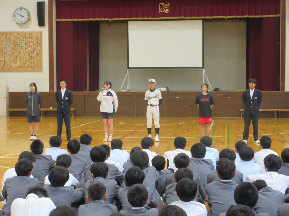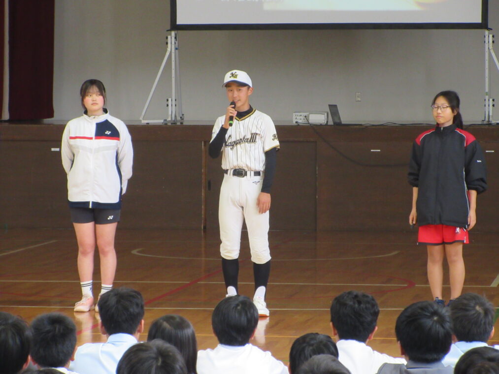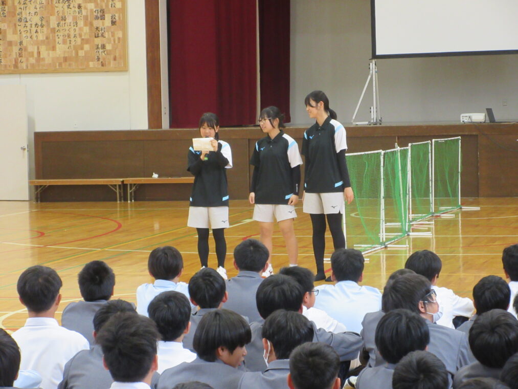 学校紹介の後は、部活動紹介が行われました。1年生にとっては、中学校で初めての部活動となります。すでに入部する部活動を決めている人もいれば、まだ悩んでいる人もいることと思います。本日の部活動見学や、明日から始まる部活動体験を上手に活用し、自分に合った部活動を探してみてください。