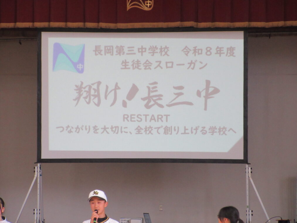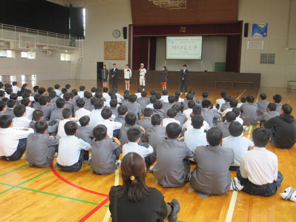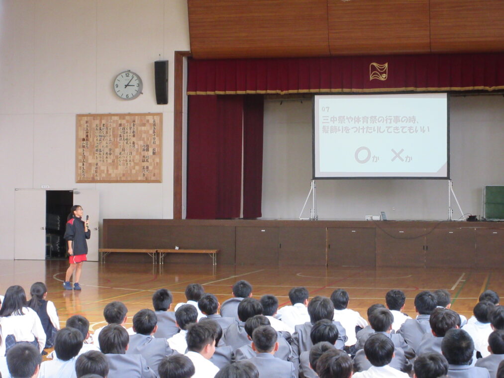 本日の6時間目に、新入生オリエンテーションを行いました。はじめに、生徒会より長三中についての紹介がありました。できる限り楽しんでもらえるよう、クイズ形式を取り入れるなど、工夫を凝らした内容となっていました。