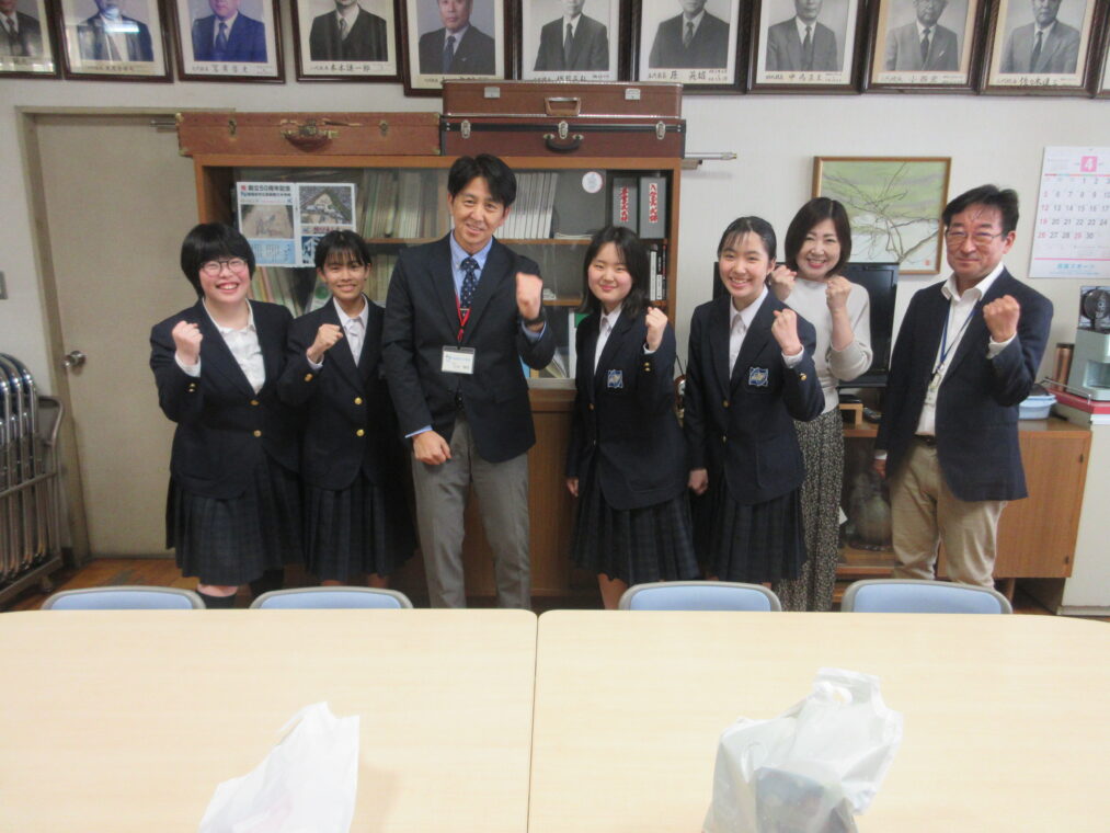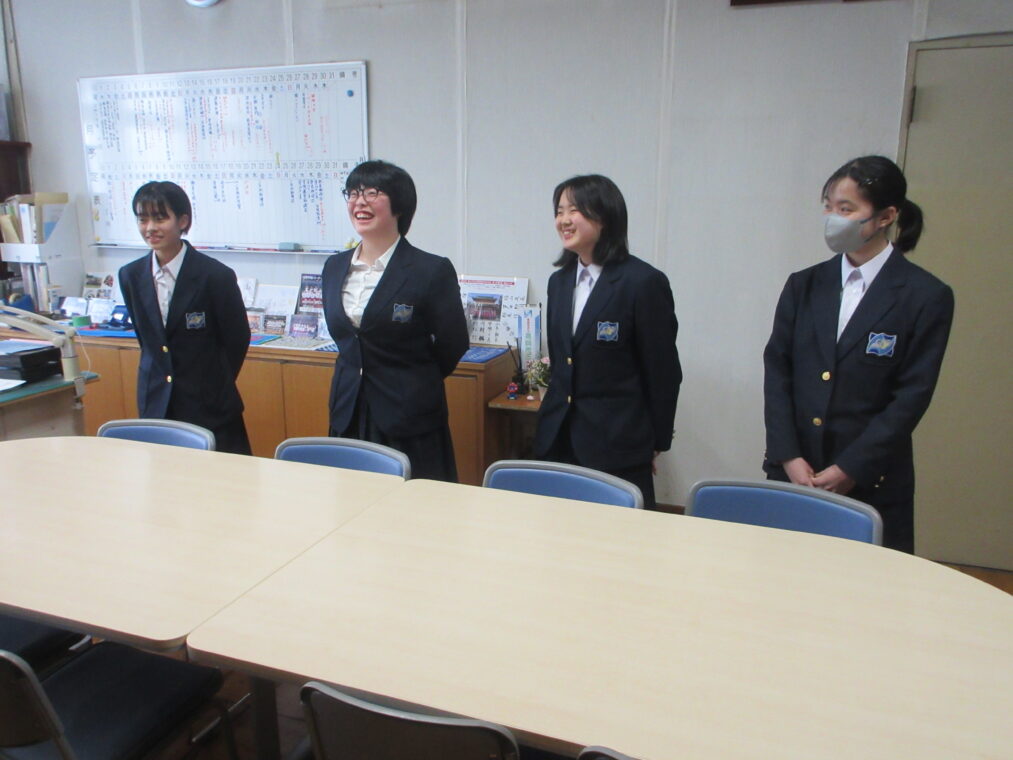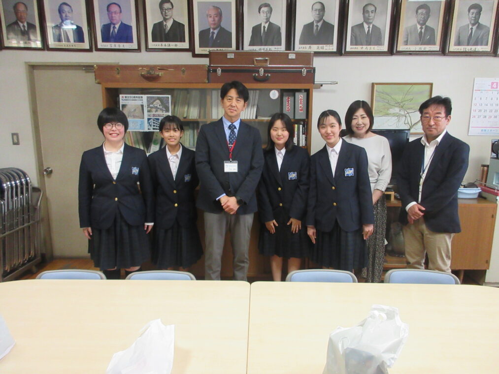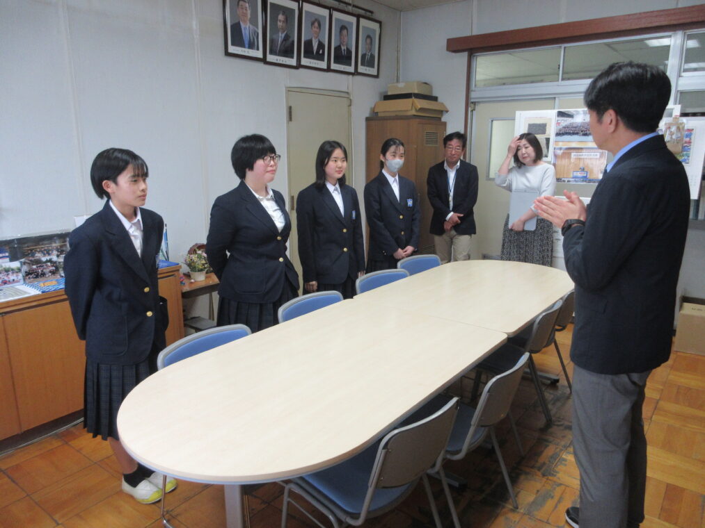 長岡京市では異なる文化や生活習慣を学び、また日本の文化を伝える経験を積むことでグローバルな人材育成を図っています。毎年、米国アーリントンへ長岡京市立中学校に在籍する生徒が、事前に十数回の学習会を行ったうえで、長岡京市の国際姉妹都市であるアメリカのマサチューセッツ州アーリントンを訪問しています。本校からも4名の生徒が参加することになっており、先だって、本日の昼休みに校長室にて激励会を行いました。4名の生徒一人一人からはアーリントン訪問への強い意志が伝わってきました。校長先生からも激励を受け、4名は明日出発します。