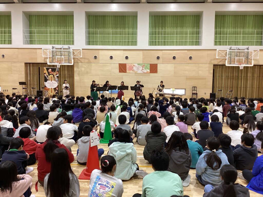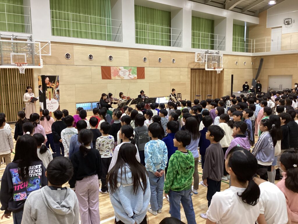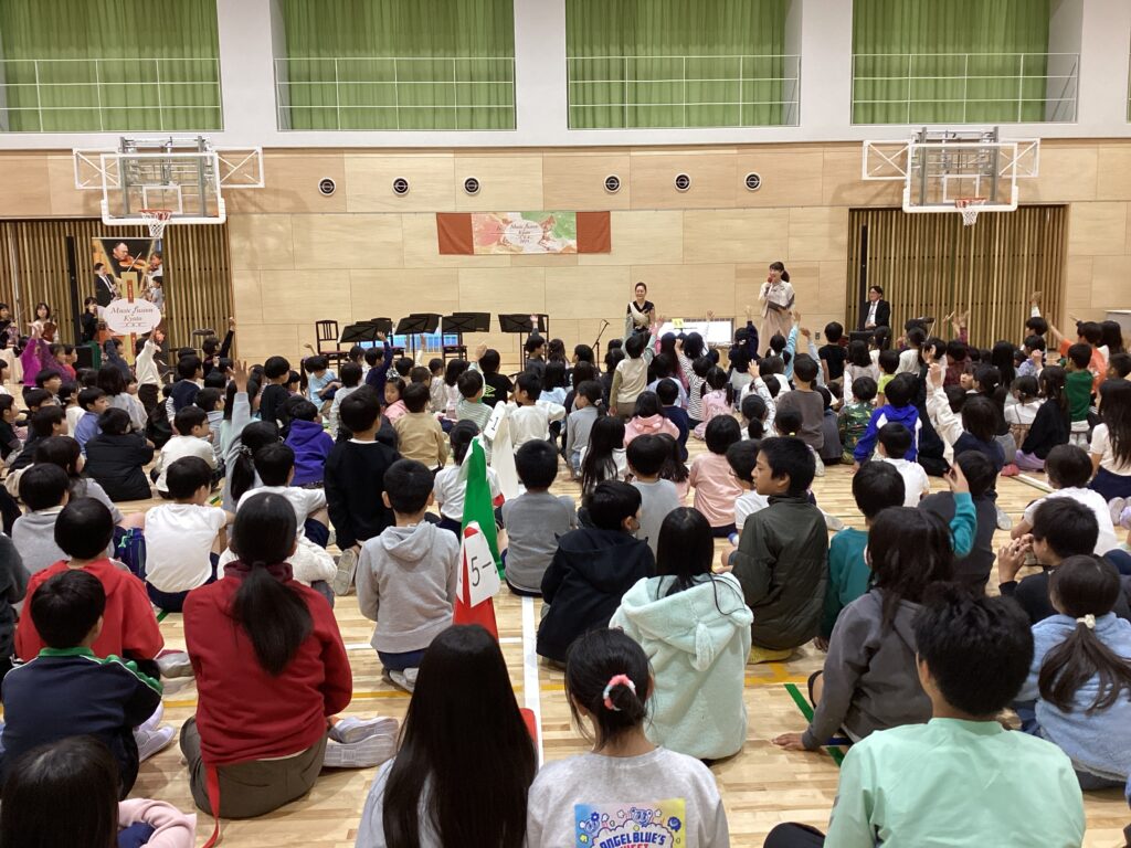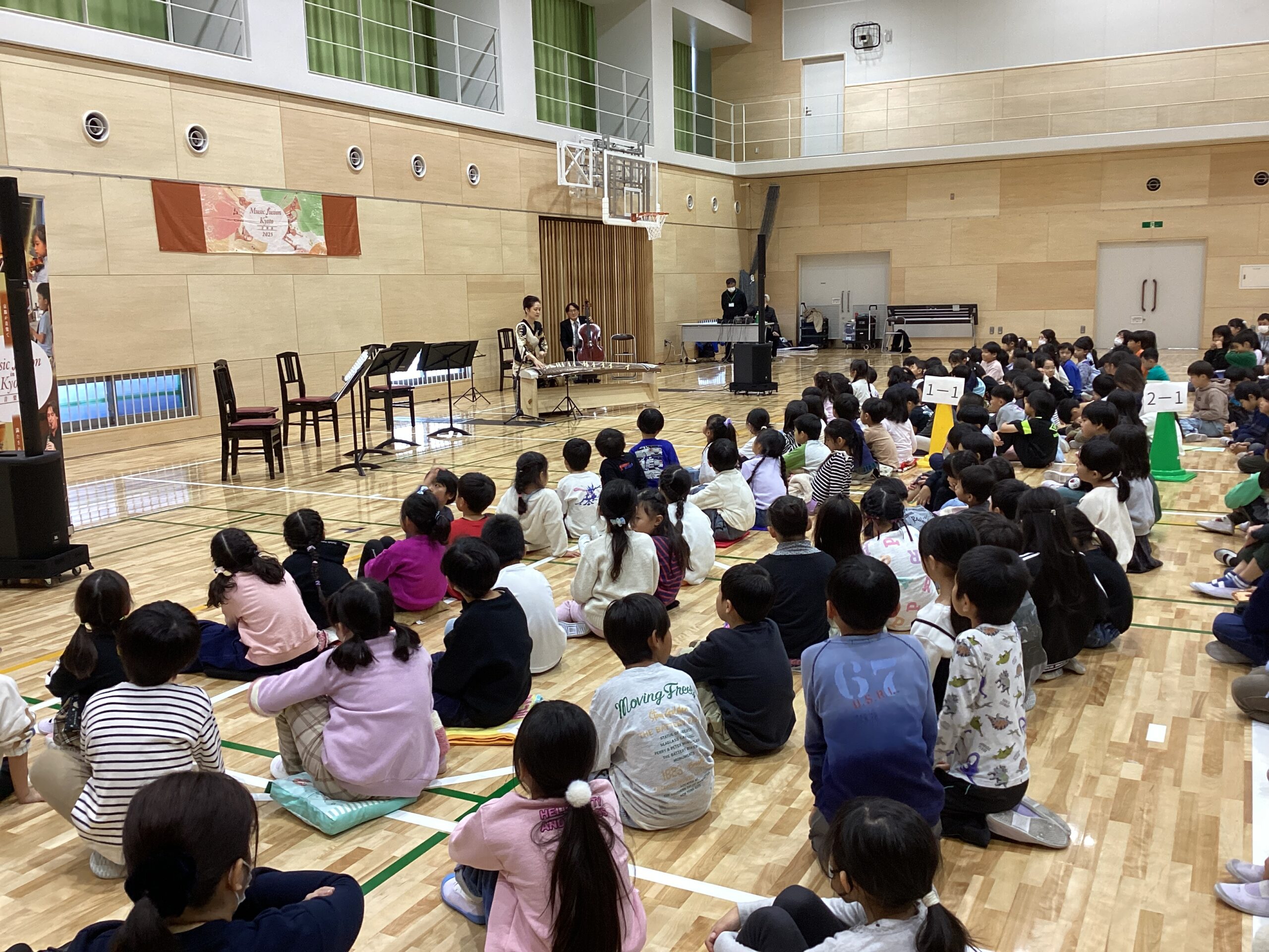 体育館に響き渡る音色に前のめりになって聴き入る姿が見られました。また、洋楽器と和楽器のコラボレーションによる校歌の演奏に子どもたちの歌声を重ね、みんなが一体感を味わう時間となりました。