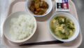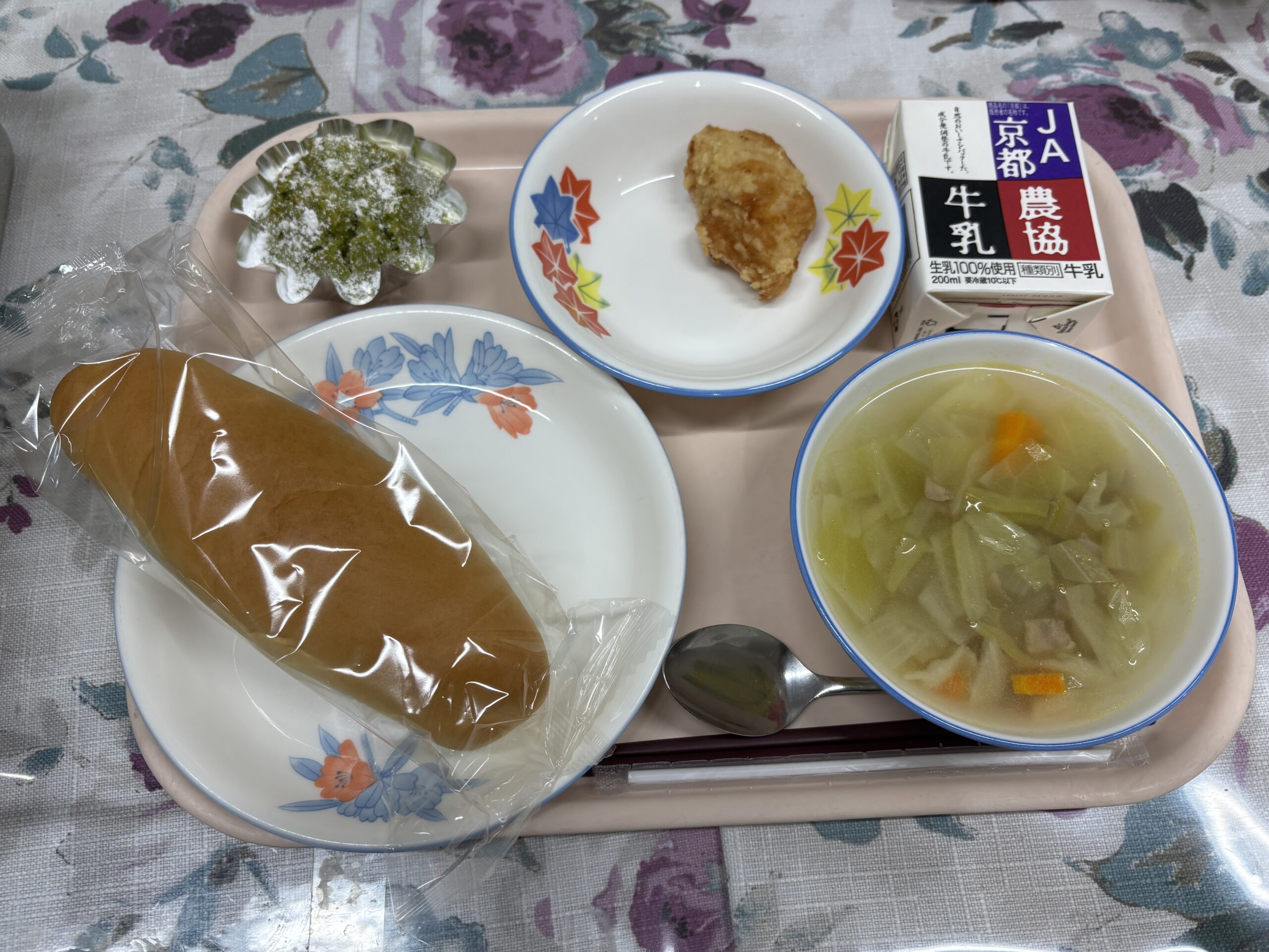 メニューは、「小型コッペパン・牛乳・フライドチキン・野菜いっぱいスープ・米粉のセレクトカップケーキ」です。