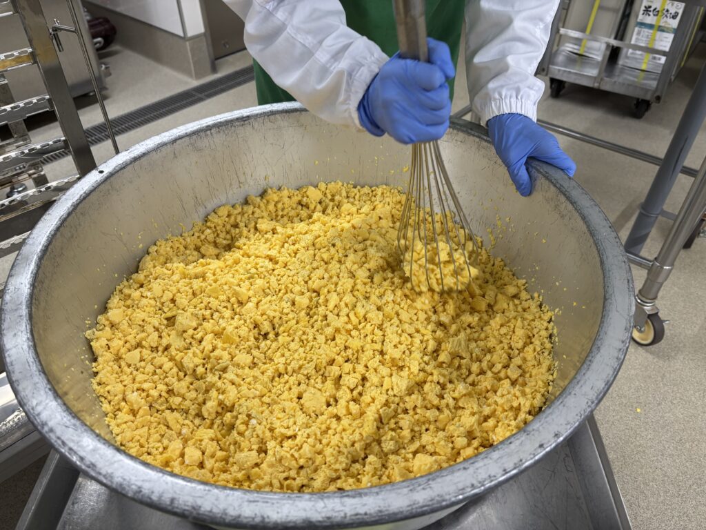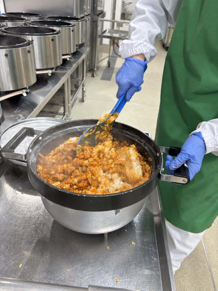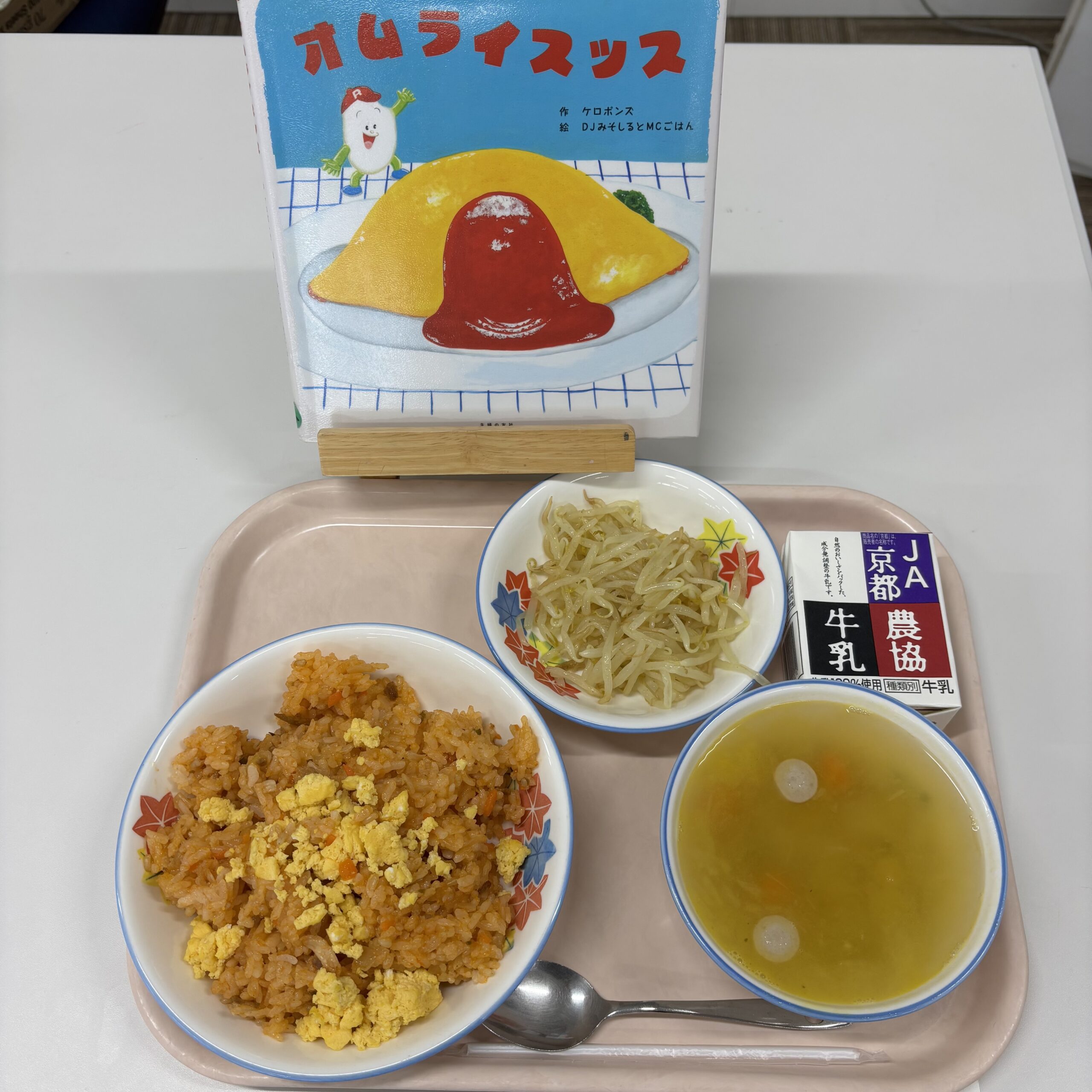 絵本の中では最後にうす焼き卵をチキンライスの上にのせて完成させますが、給食では400人分のうす焼き卵を作ることが難しいため、チキンライスの上にスクランブルエッグをのせる「スクランブルオムライス」が登場しました。