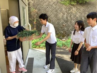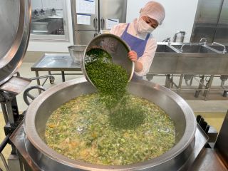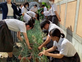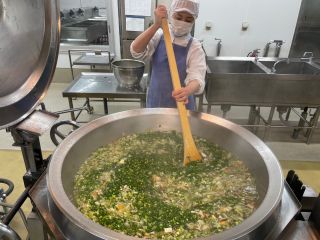 今日のワンタンスープには、給食委員が1学期から育ててきた九条ネギが入っています。昨日小雨の降る中、収穫したのですが、ネギの香りがよく、柔らかくとてもおいしそうでした。たっぷりのネギが入ったワンタンスープを食べて、おいしいなあと感じて、健康に過ごしてもらえると嬉しいです。