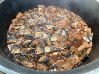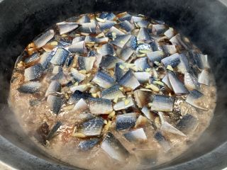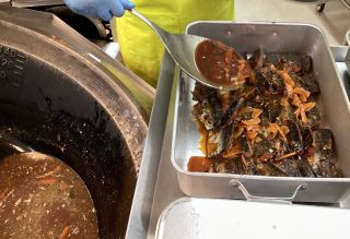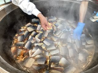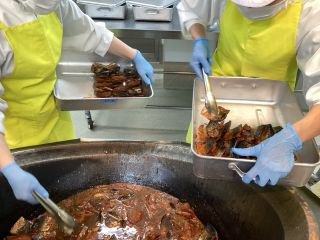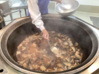 給食室では、体に良い鯖をおいしく食べてもらいたいと、丁寧に煮魚を作りました。まず、しょうゆや砂糖、みりん、酒を煮立たせたところに鯖と生姜を交互に入れていきます。