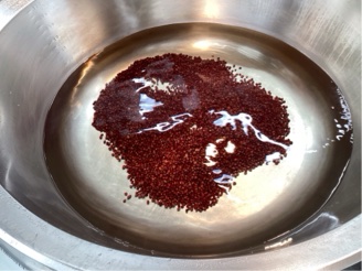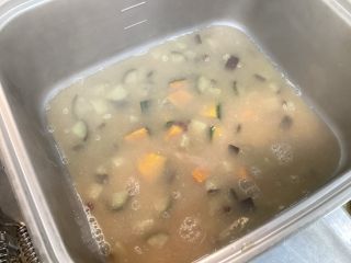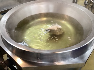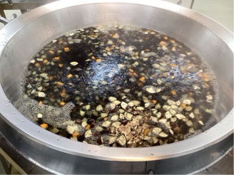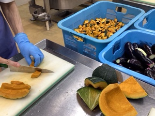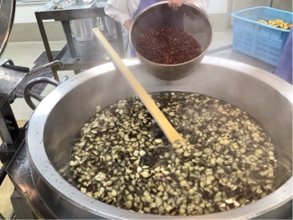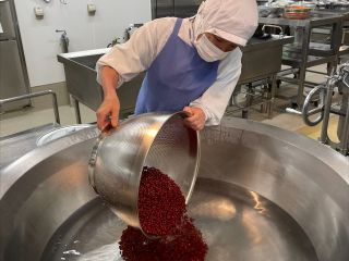 削り節でとっただし汁に、なす、かぼちゃ、小豆を入れ、みそとしょうゆで味をつけて完成です!!