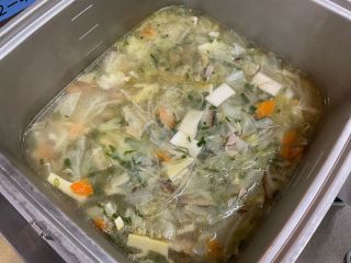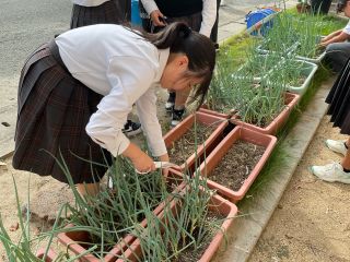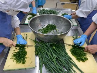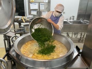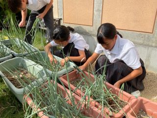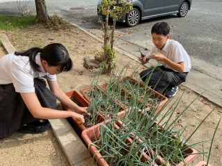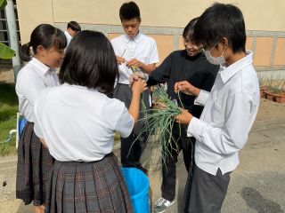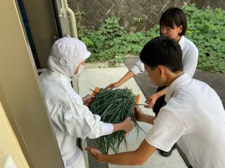 今日の給食(九条ネギ) 学校日誌 2025.10.16 2025.10.15 今日のワンタンスープには、前期給食委員が育ててきた九条ネギを使いました! 当番制で毎日欠かさず水やりをしてきた九条ネギをみんなで収穫し、それを調理員さんが料理してくださいました。 ねぎの良い香りが漂う、特別なワンタンスープでした。