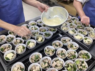 今日はこのネギをぶつ切りにし、鶏肉しめじと炒めて具を作り、カップに分けてマヨみそソースをかけました。